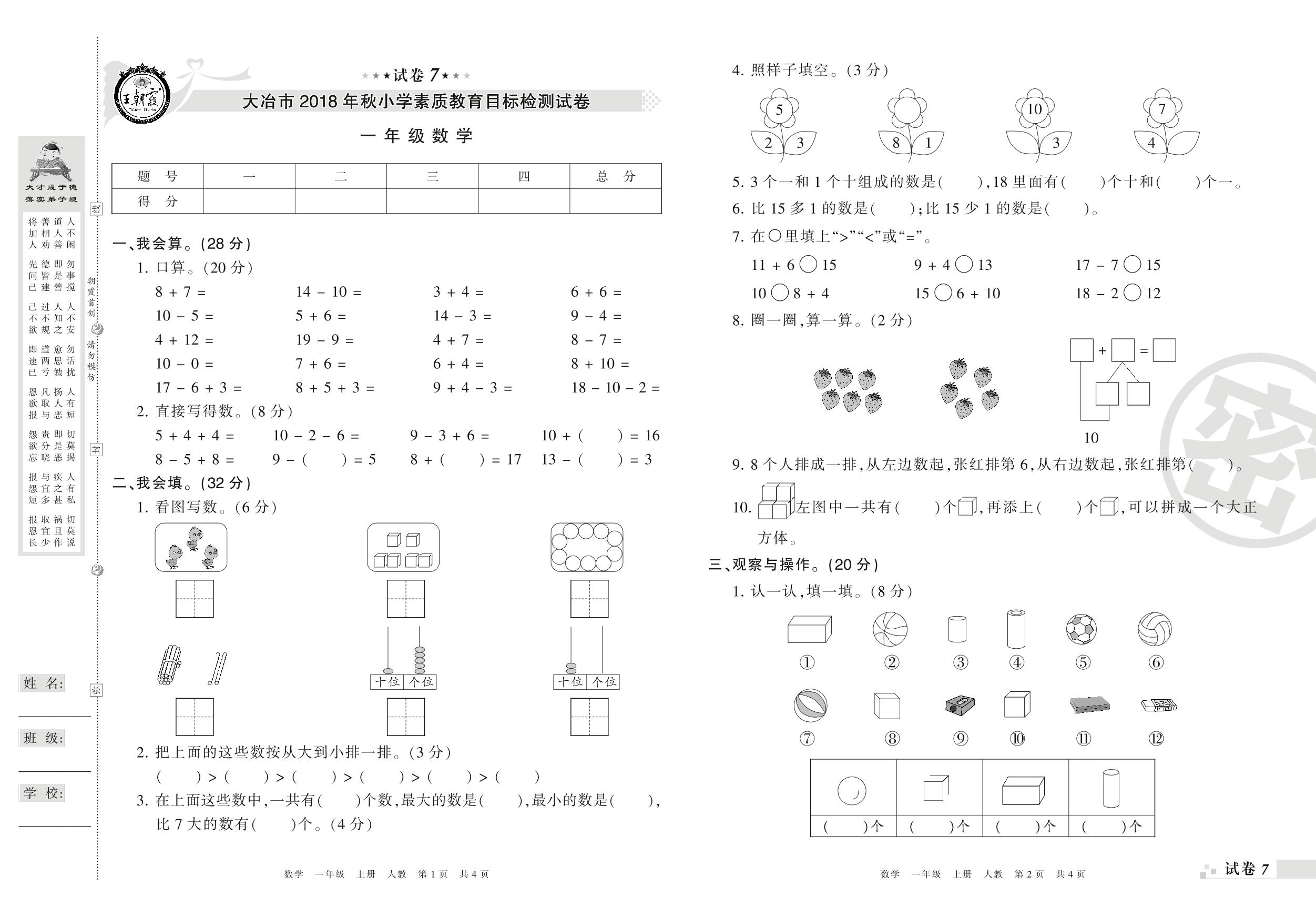2018-2019学年第一学期大冶市一年级数学试卷(人教版)【7】