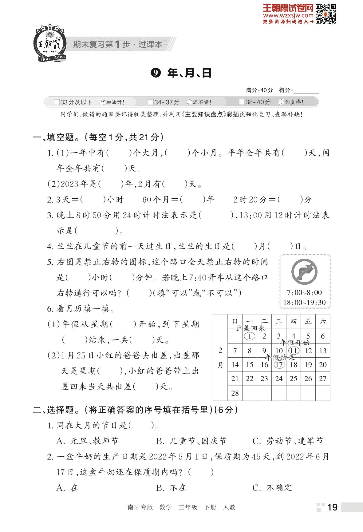 王朝霞期末过课本——9 年、月、日三年级下册数学(人教版)_R230424135944412