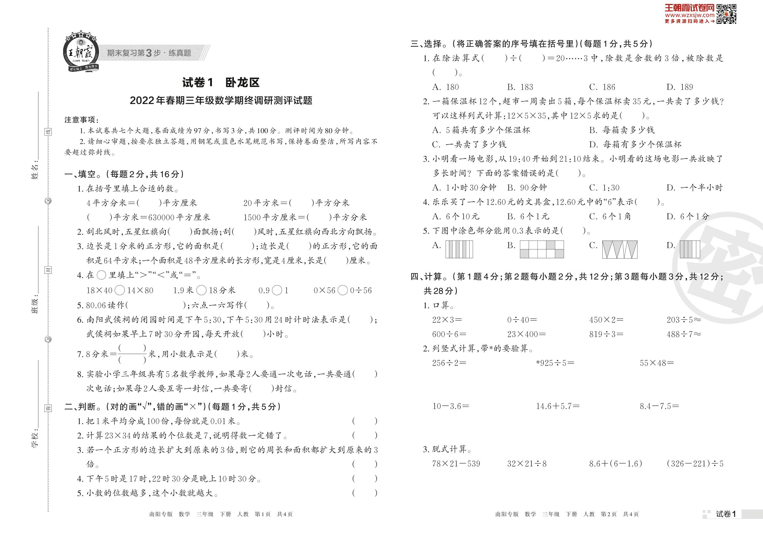 卧龙区2022年春期三年级数学期终调研测评试题(人教版)【1】