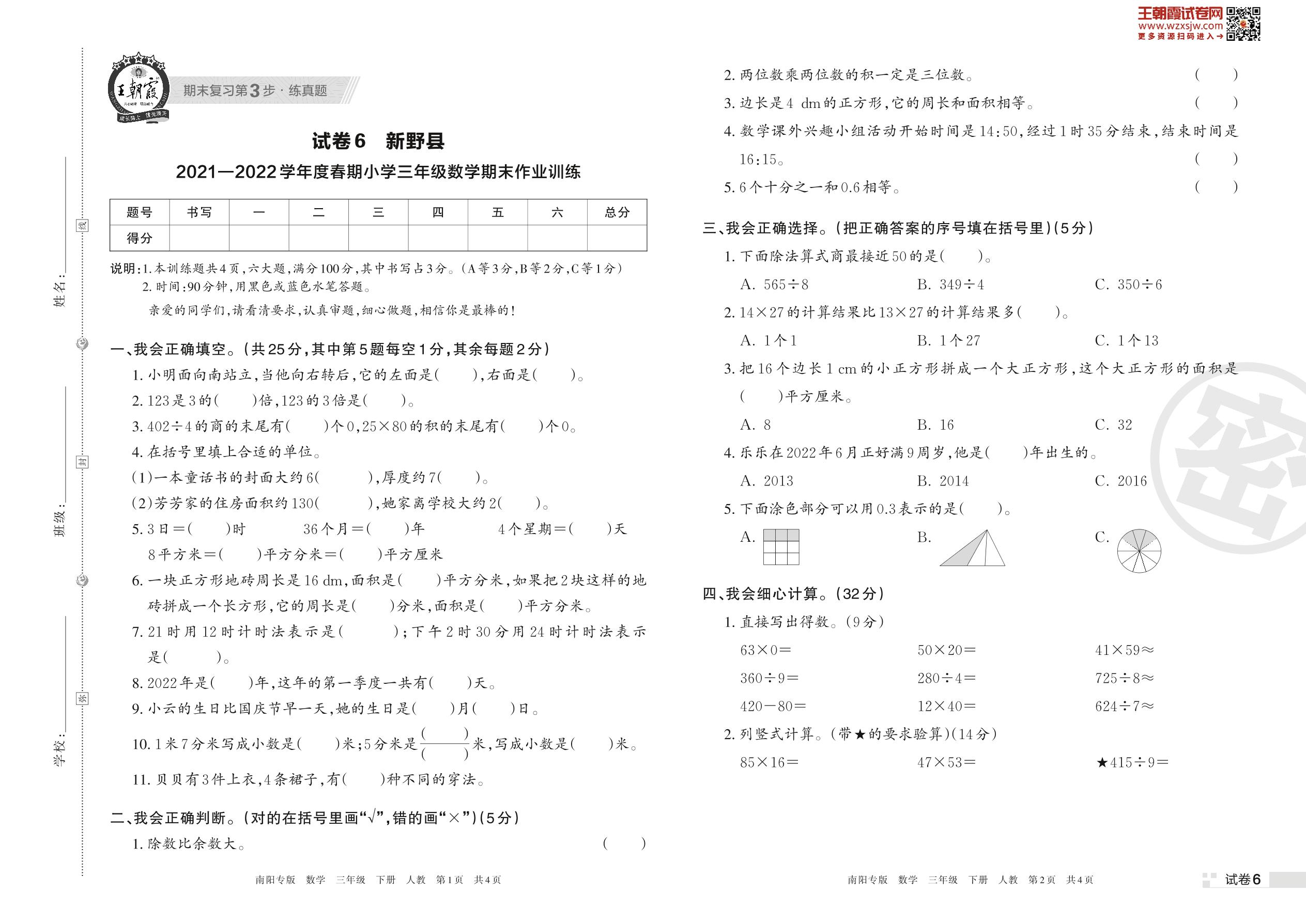 新野县2021—2022学年度春期小学三年级数学期末作业训练(人教版)【6】