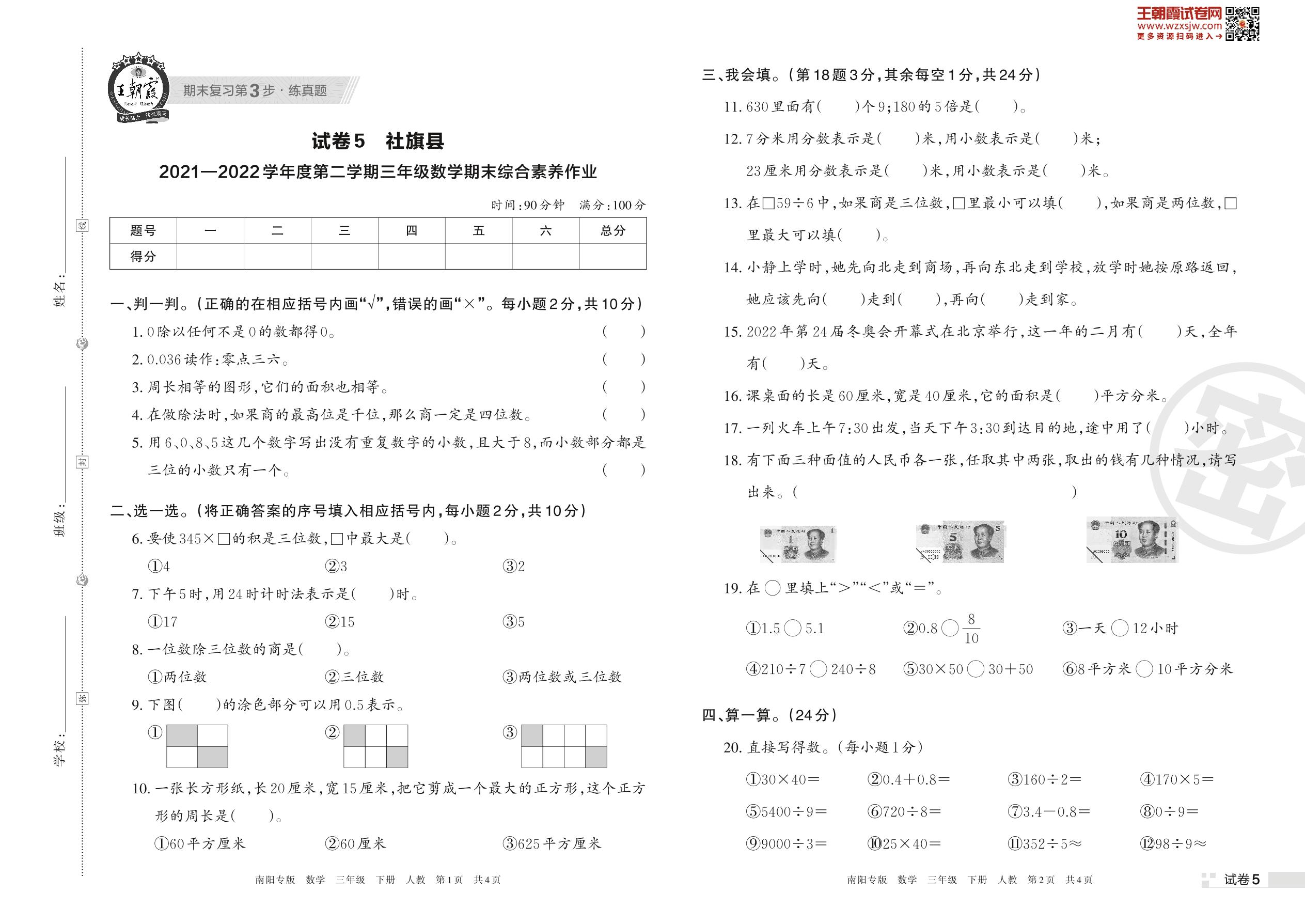 社旗县2021—2022学年度第二学期三年级数学期末综合素养作业(人教版)【5】