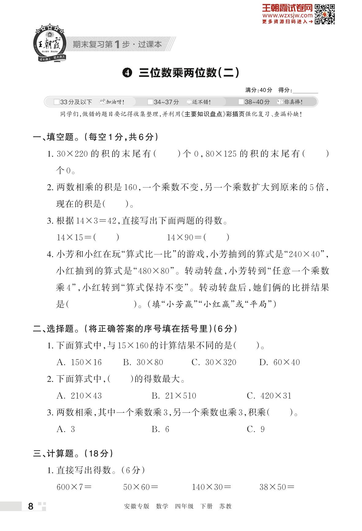 王朝霞期末过课本——4 三位数乘两位数(二)四年级下册数学(苏教版)_R230424140315743