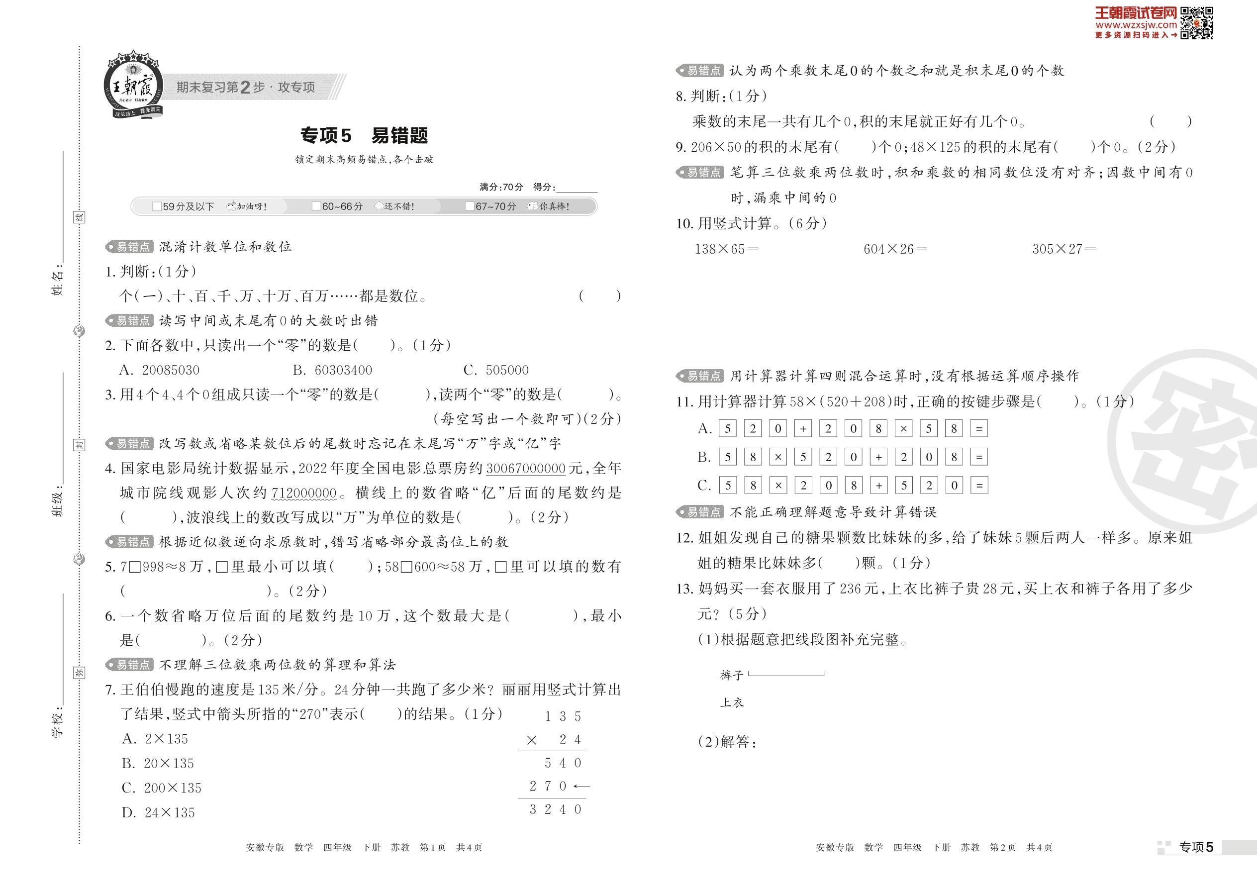 王朝霞期末专项卷——易错题四年级下册数学(苏教版)_R230424140315475【5】