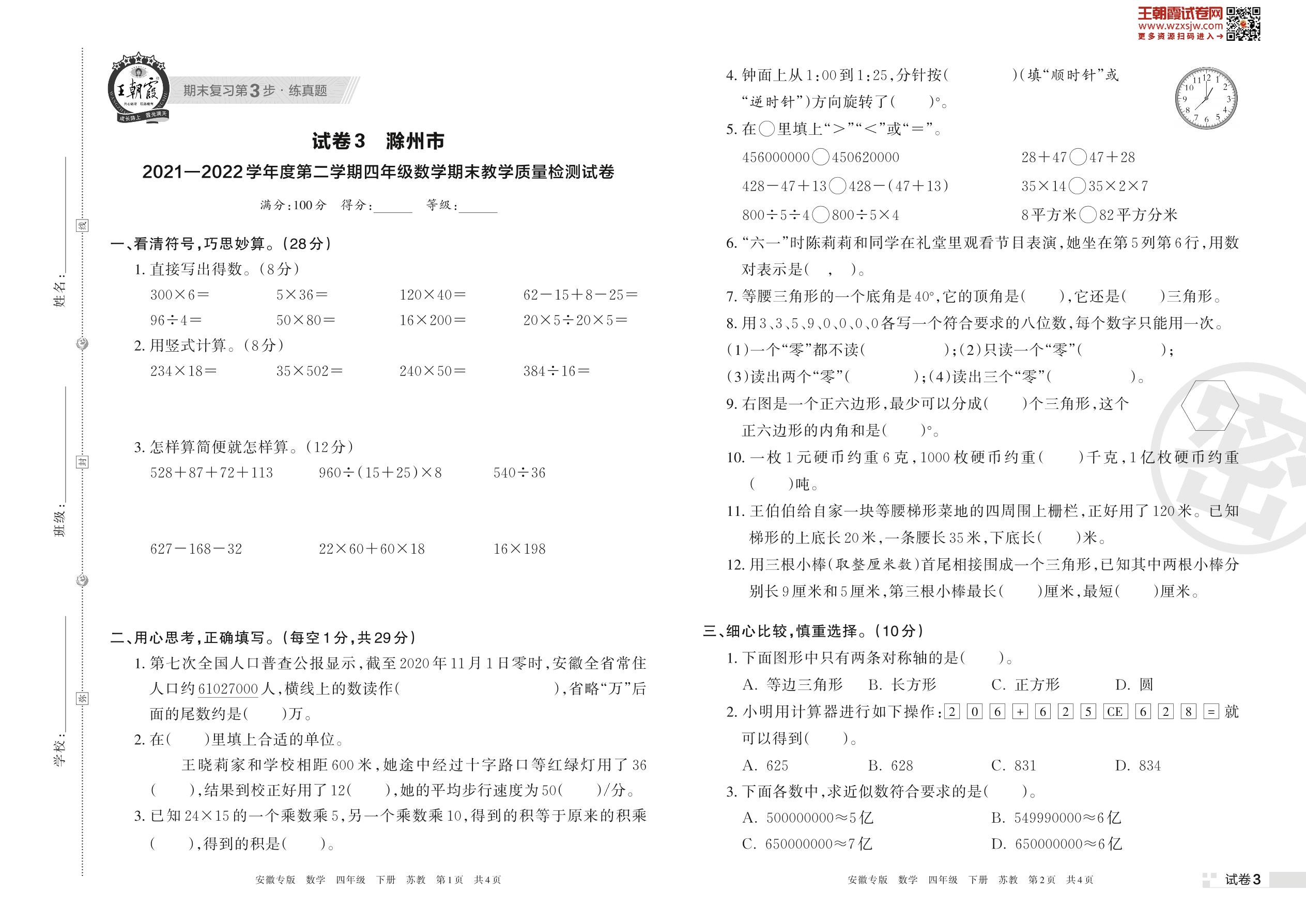 滁州市2021—2022学年度第二学期四年级数学期末教学质量检测试卷(苏教版)【3】