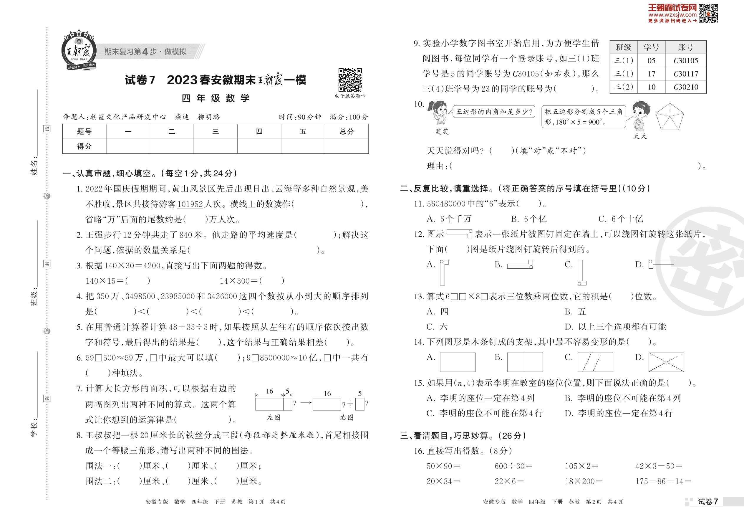王朝霞期末模拟卷四年级下册数学(苏教版)_R230424140316351【7】