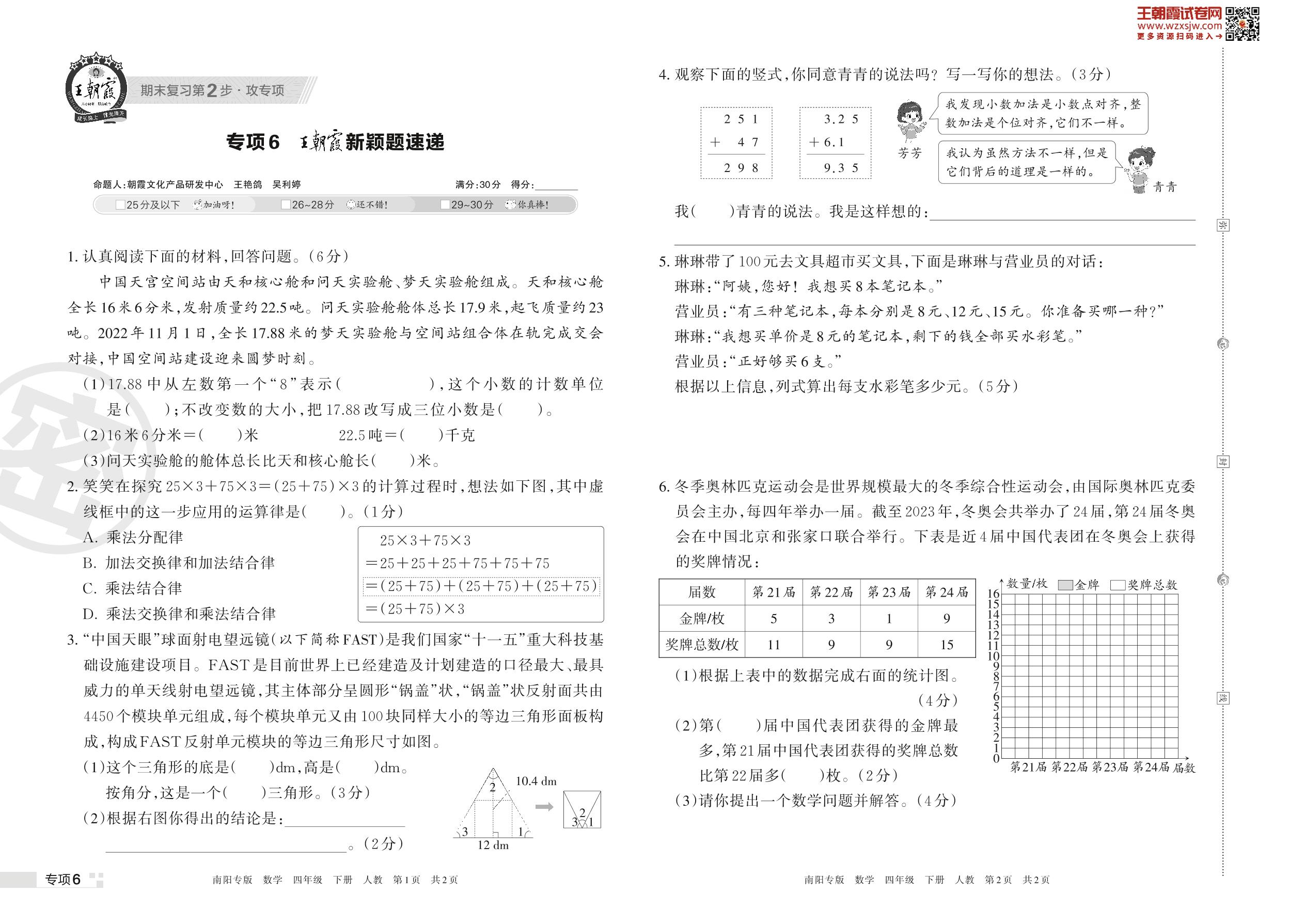 王朝霞期末专项卷——王朝霞新颖题速递四年级下册数学(人教版)【6】
