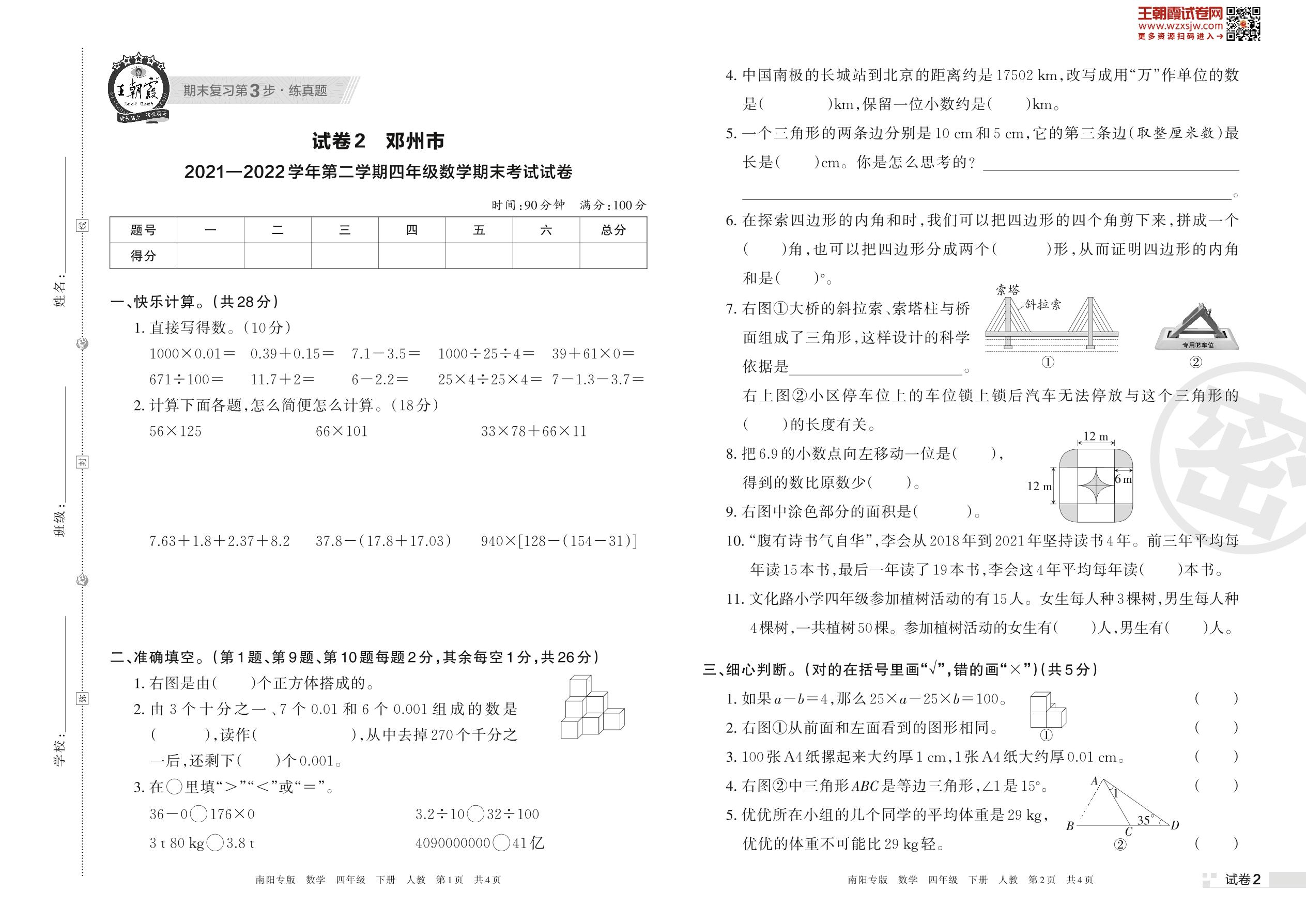 邓州市2021—2022学年第二学期四年级数学期末考试试卷(人教版)【2】