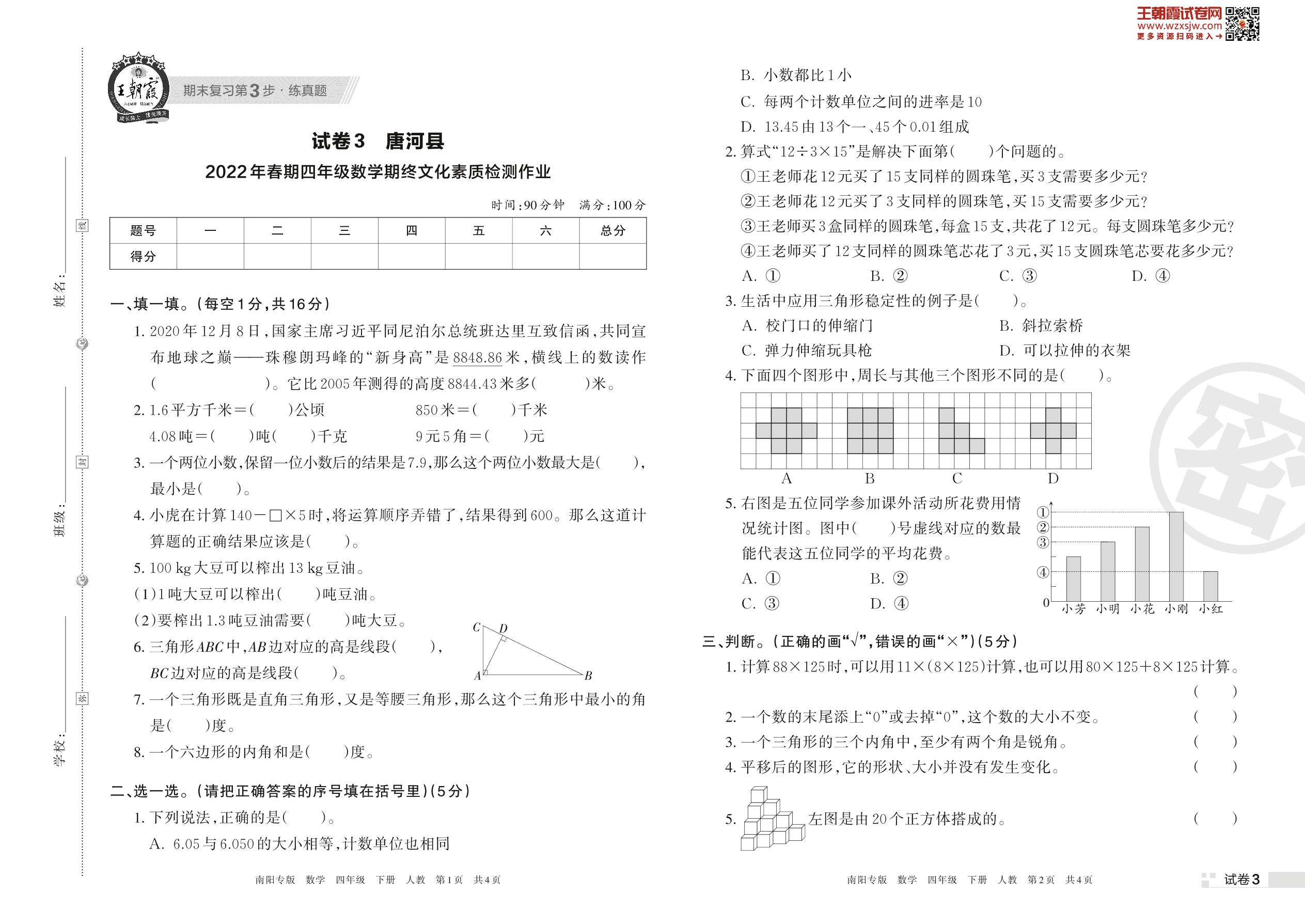 唐河县2022年春期四年级数学期终文化素质检测作业(人教版)【3】