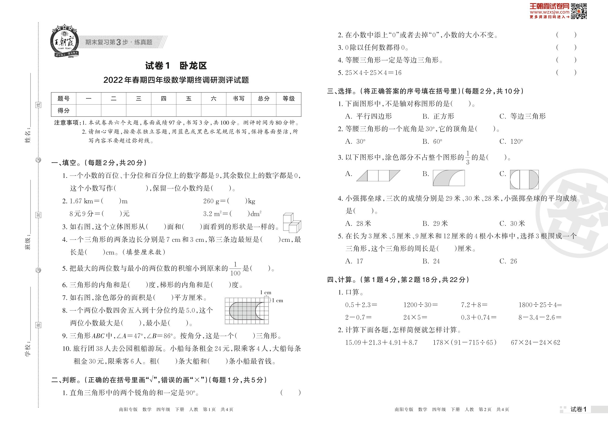 卧龙区2022年春期四年级数学期终调研测评试题(人教版)【1】