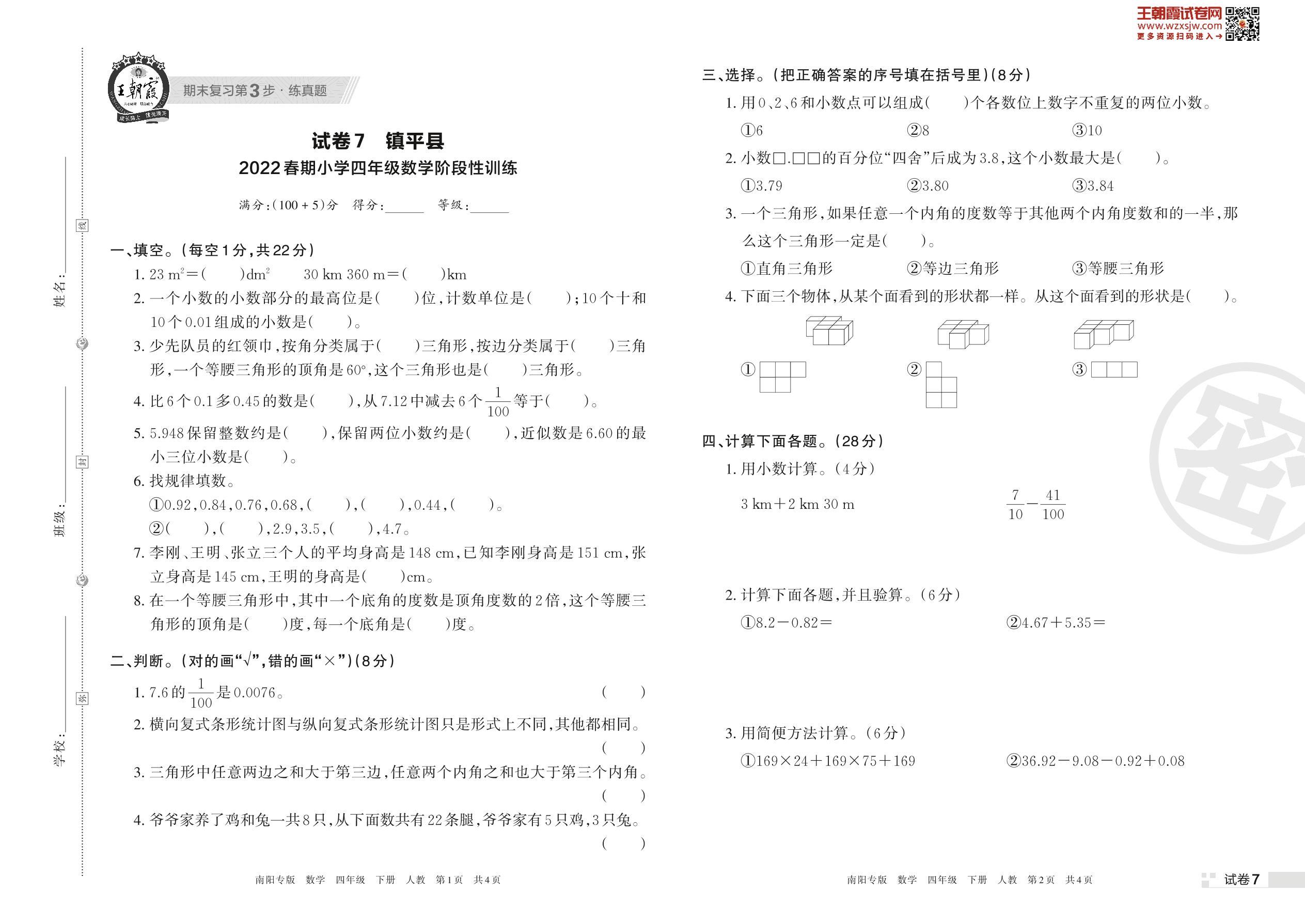 镇平县2022春期小学四年级数学阶段性训练(人教版)【7】