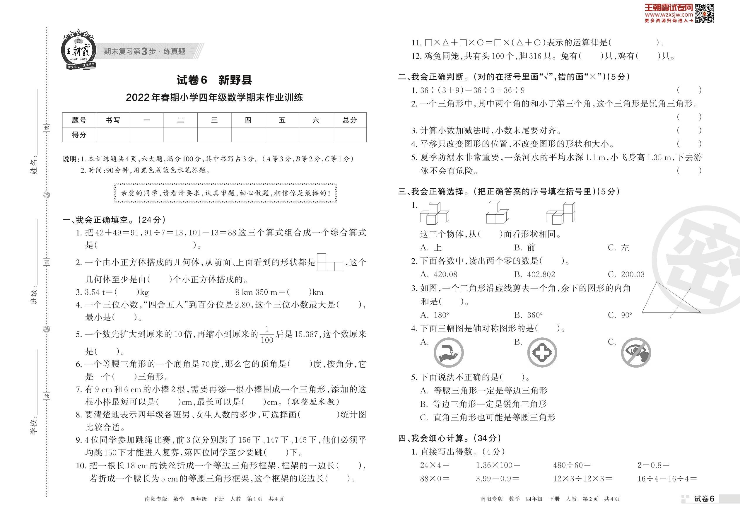新野县2022年春期小学四年级数学期末作业训练(人教版)【6】