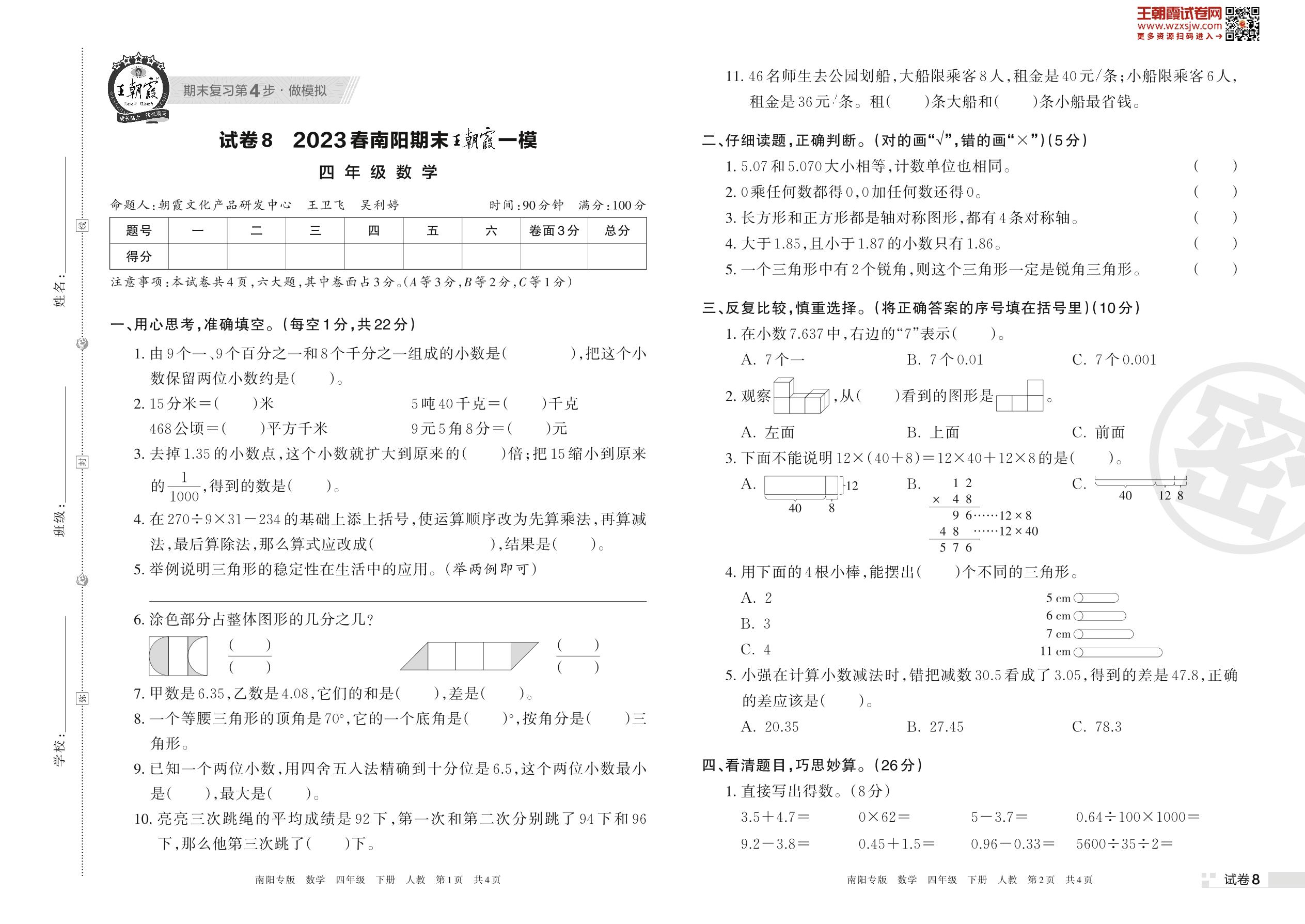 王朝霞期末模拟卷四年级下册数学(人教版)_R230424140508218【8】
