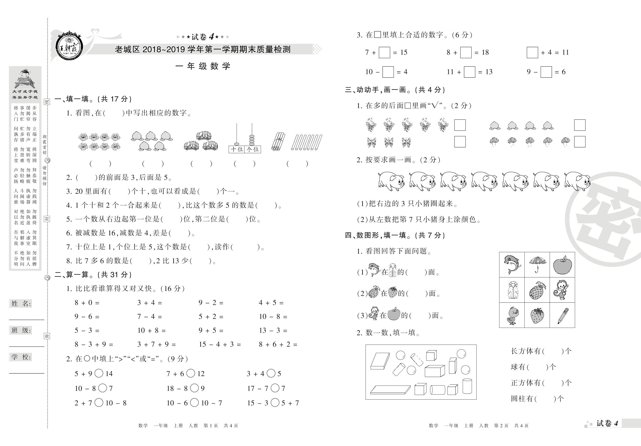 2018-2019学年第一学期洛阳市老城区一年级数学试卷(人教版)【4】