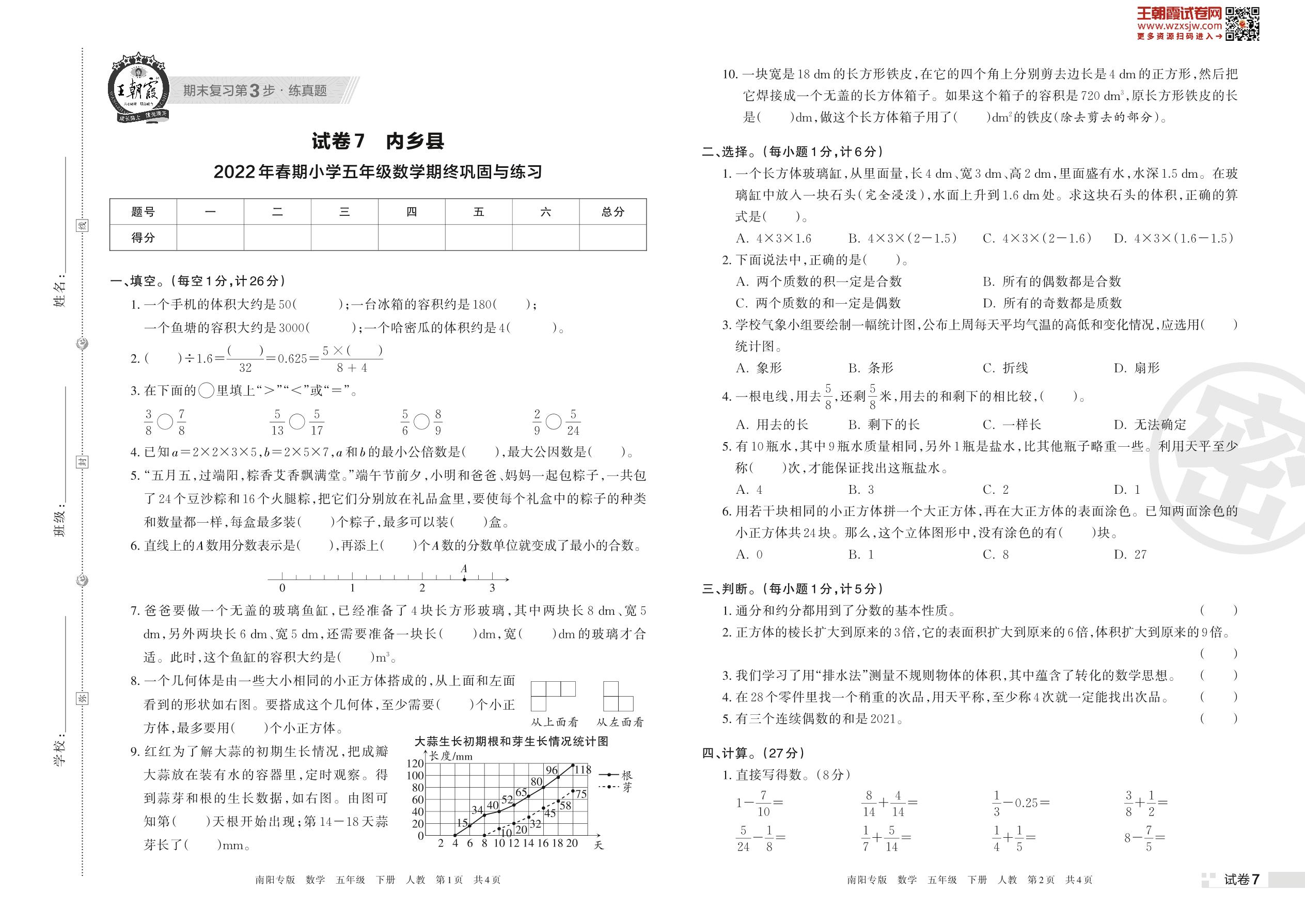 内乡县2022年春期小学五年级数学期终巩固与练习(人教版)【7】