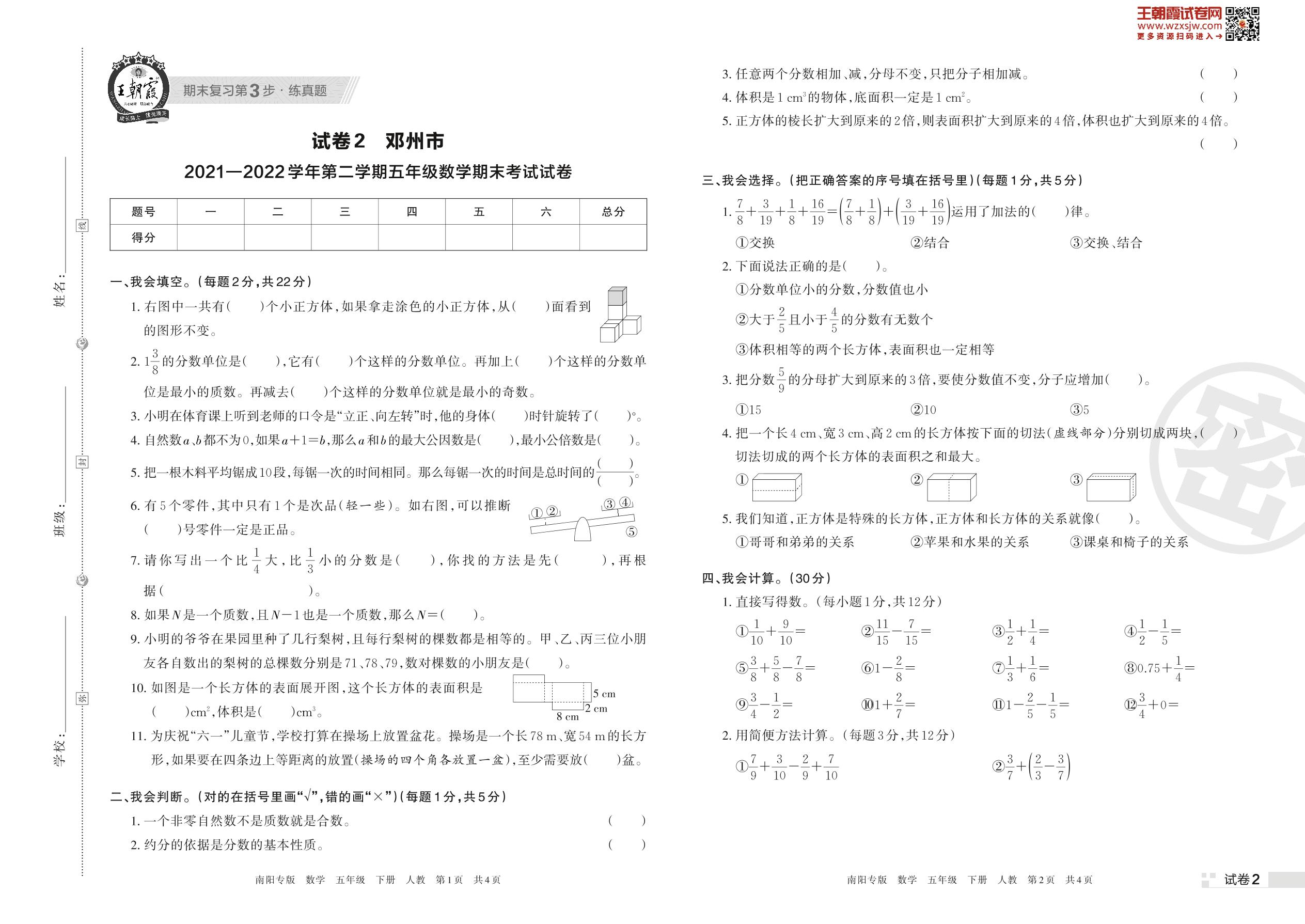邓州市2021—2022学年第二学期五年级数学期末考试试卷(人教版)【2】
