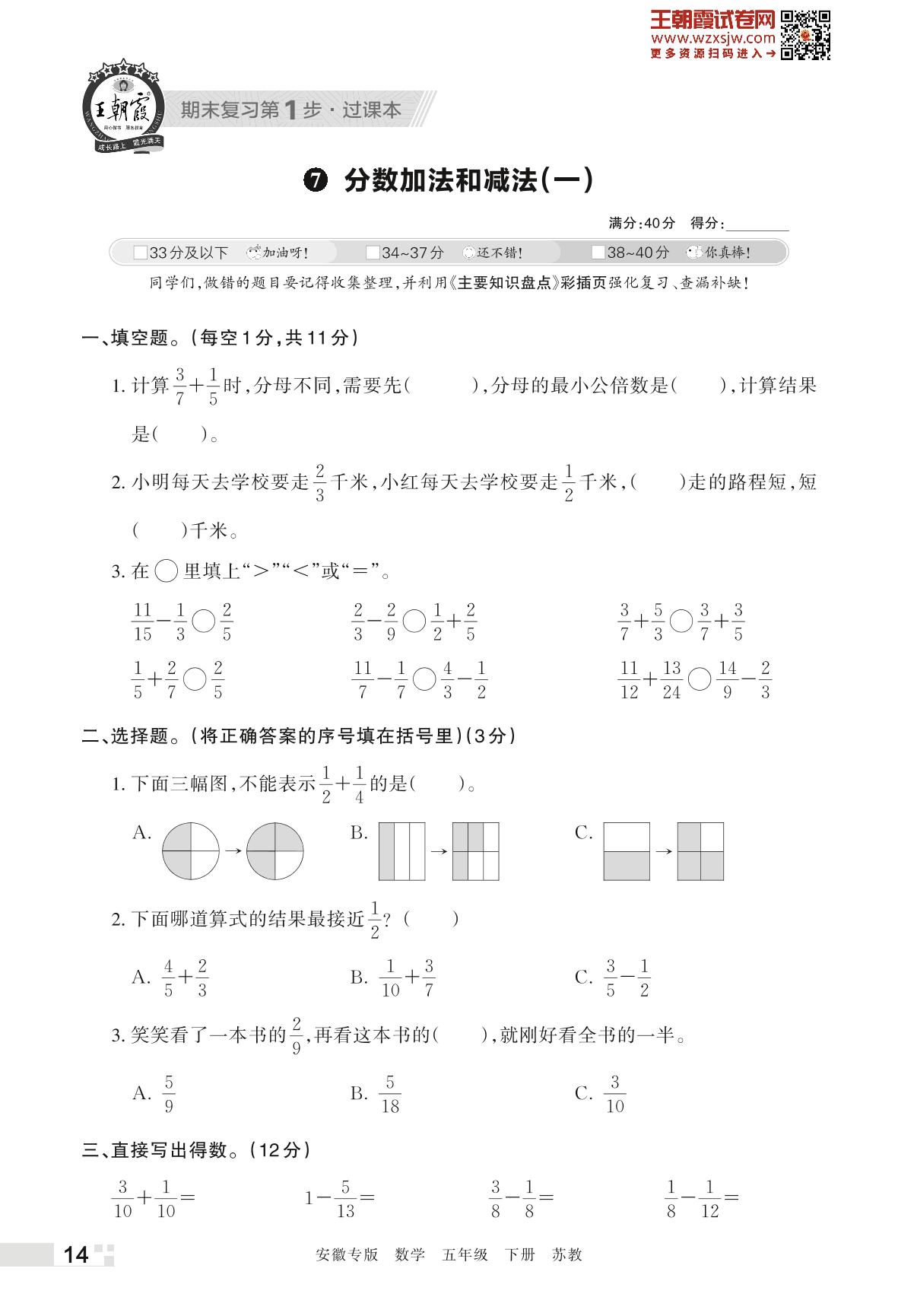 王朝霞期末过课本——7 分数的加法和减法(一)五年级下册数学(苏教版)