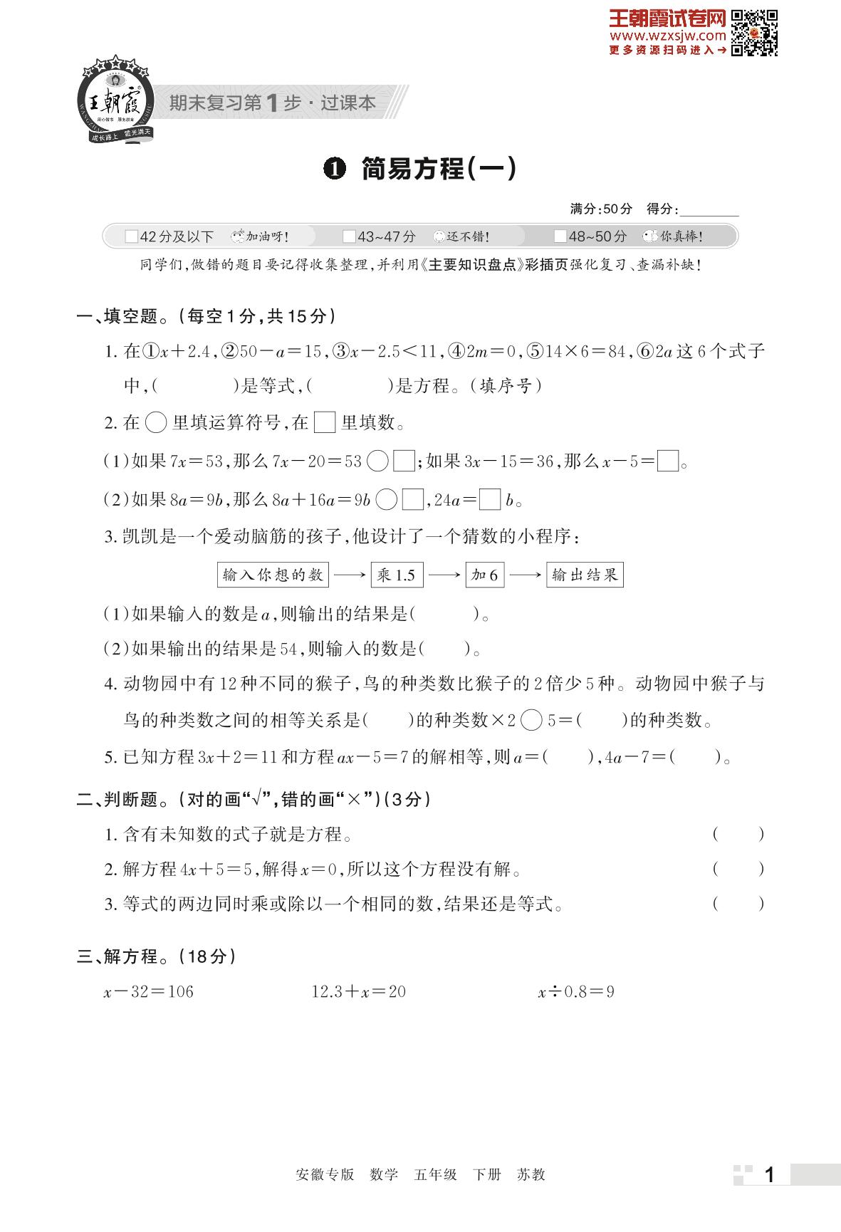 王朝霞期末过课本——1 简易方程(一)五年级下册数学(苏教版)_R230424141636945