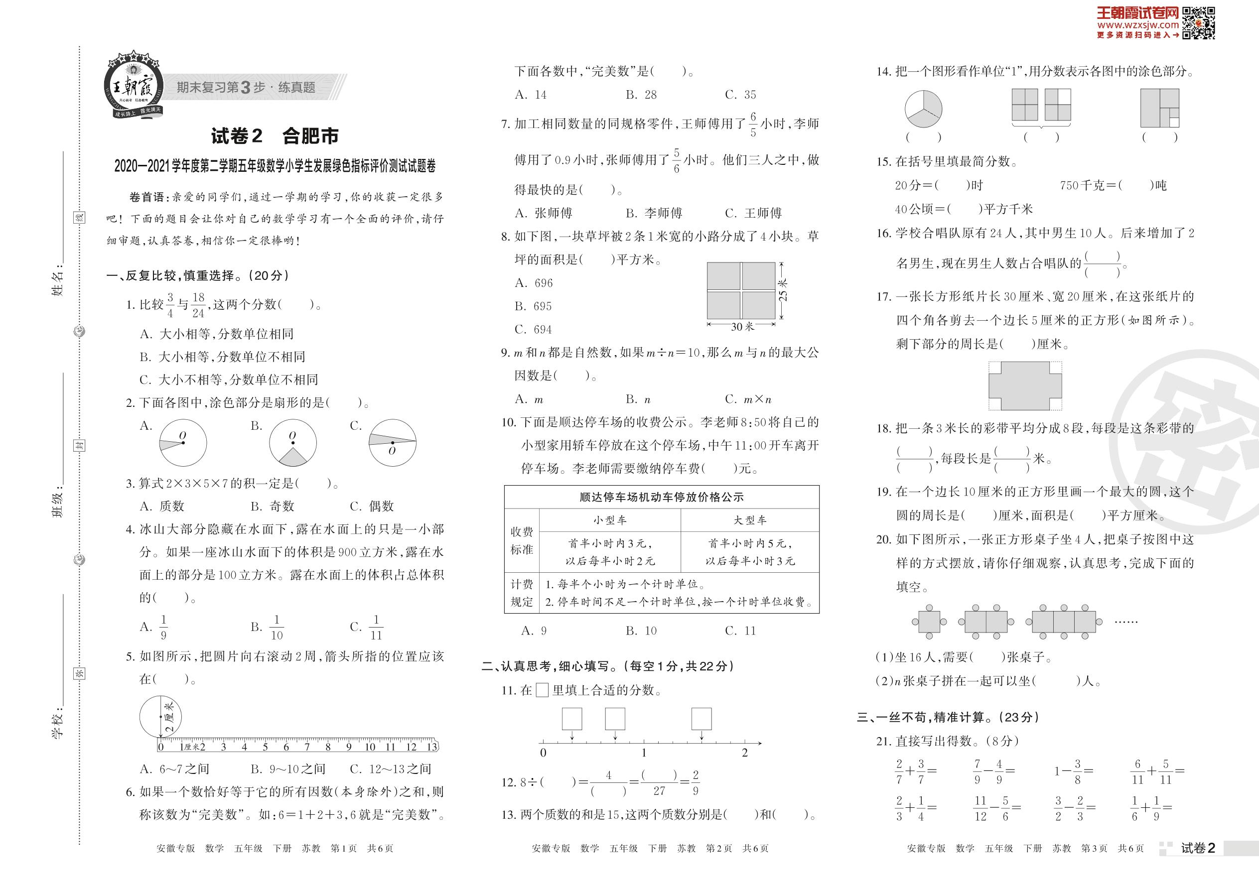 合肥市2020—2021学年度第二学期五年级数学小学生发展绿色指标评价测试试题卷(苏教版)【2】