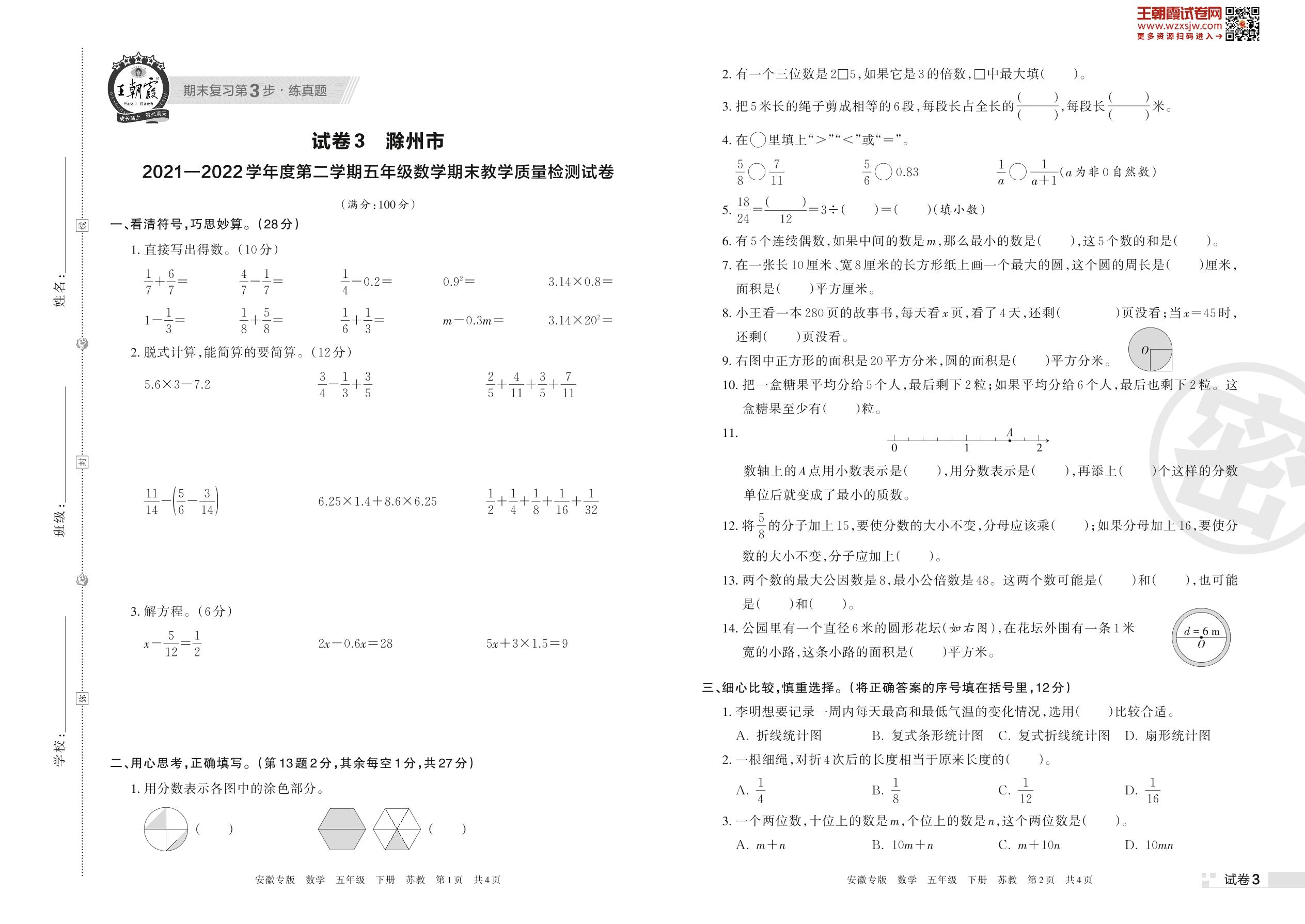 滁州市2021—2022学年度第二学期五年级数学期末教学质量检测试卷(苏教版)【3】