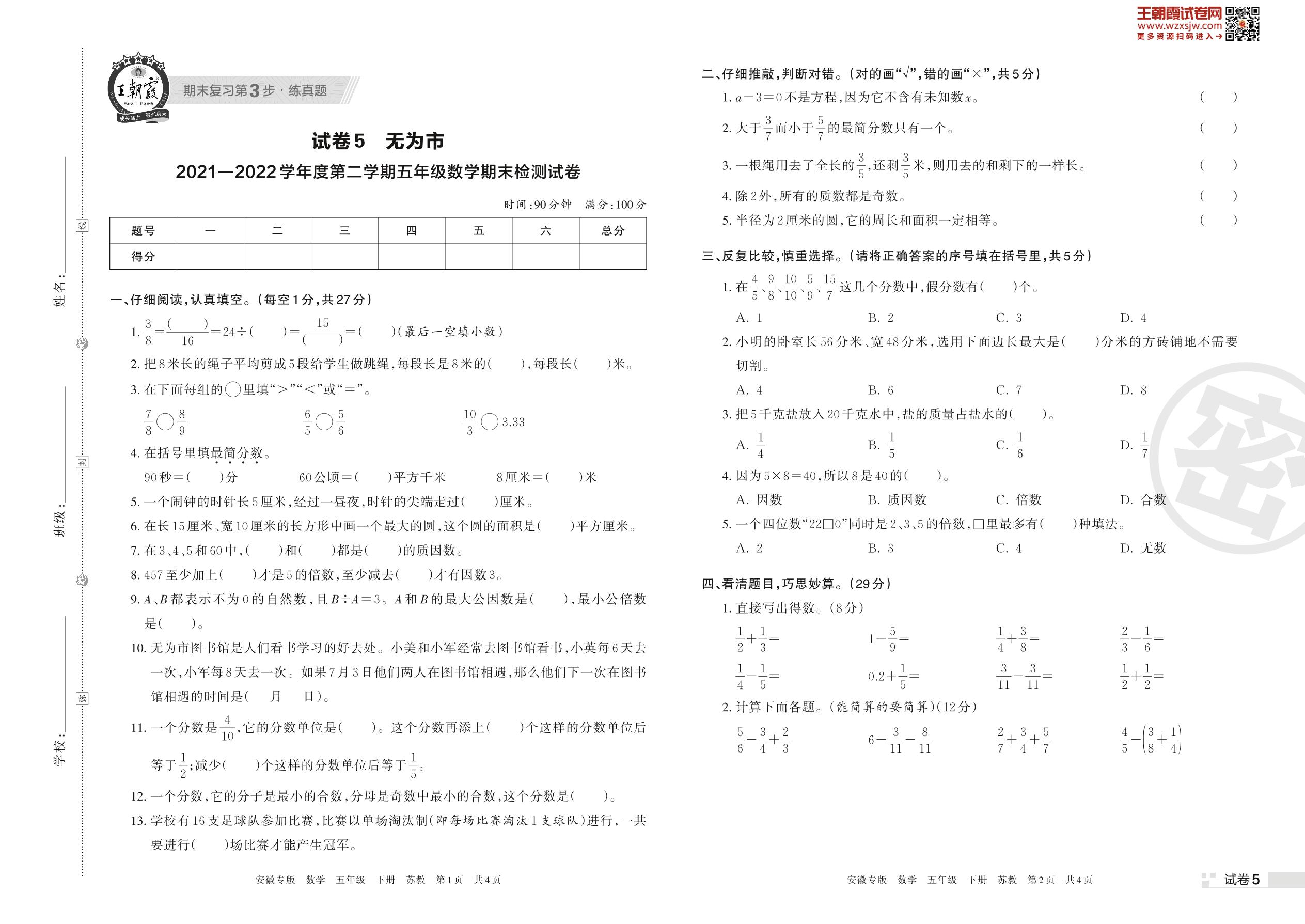 无为市2021—2022学年度第二学期五年级数学期末检测试卷(苏教版)【5】