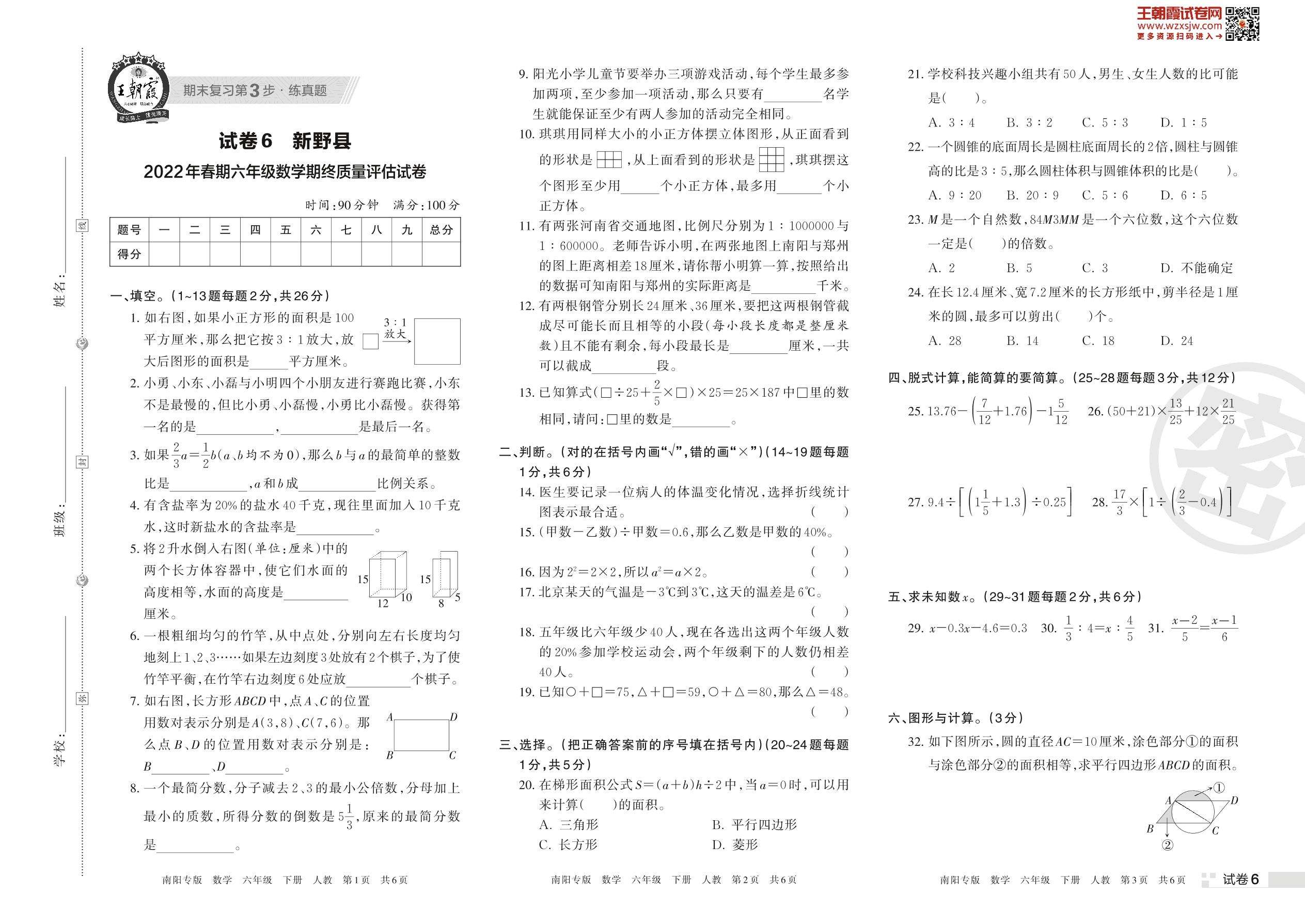 新野县2022年春期六年级数学期终质量评估试卷(人教版)【6】