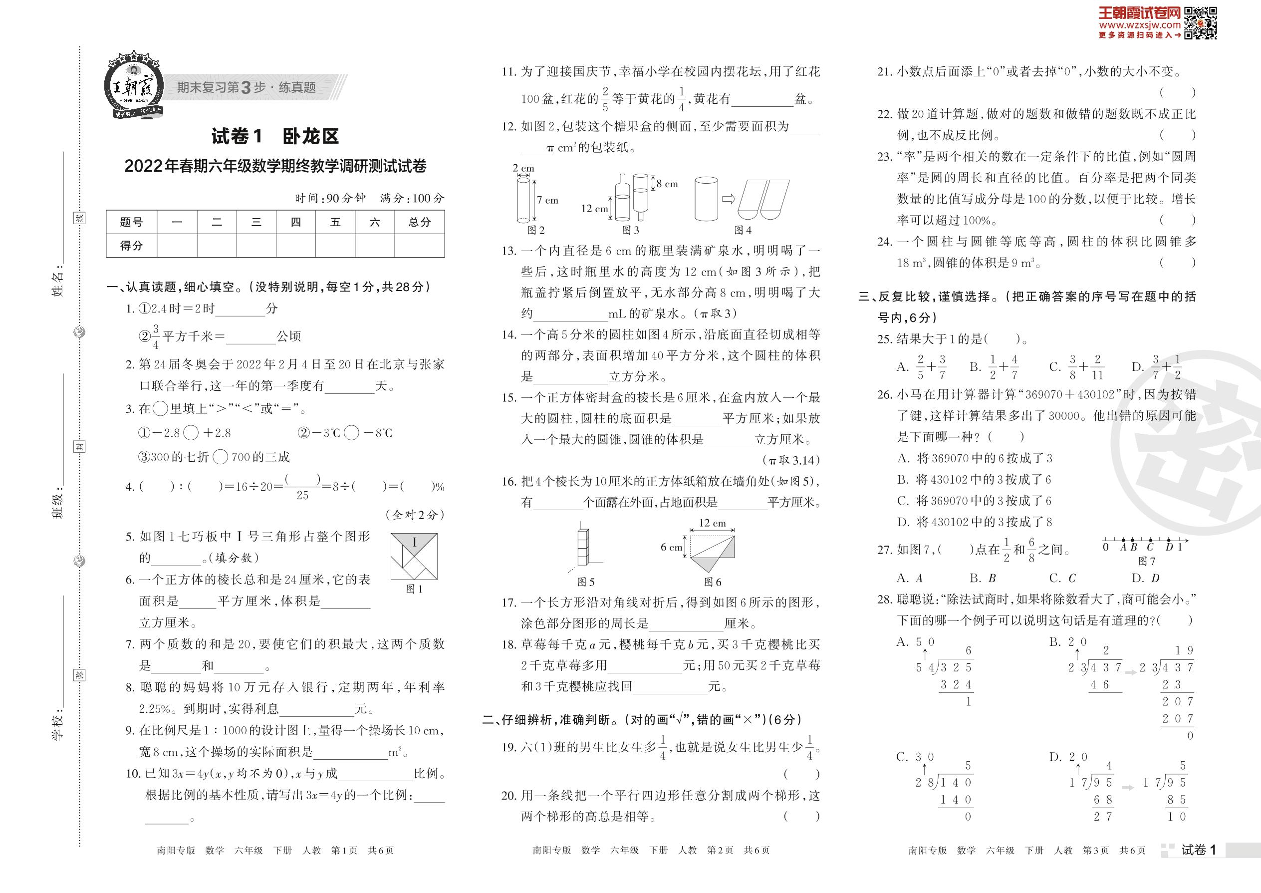 卧龙区2022年春期六年级数学期终教学调研测试试卷(人教版)【1】