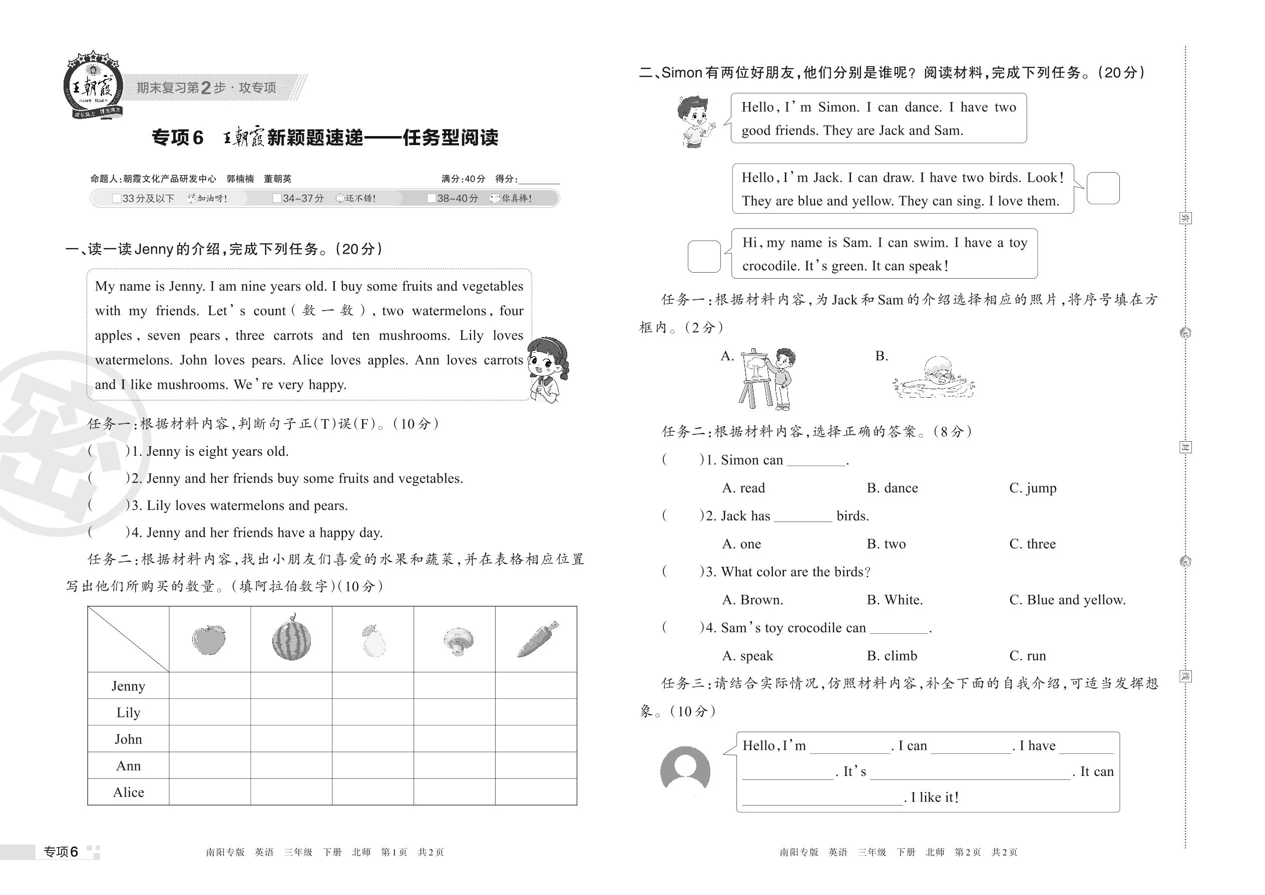 王朝霞期末专项卷——王朝霞新颖题速递:任务型阅读三年级下册英语(北师版)【6】