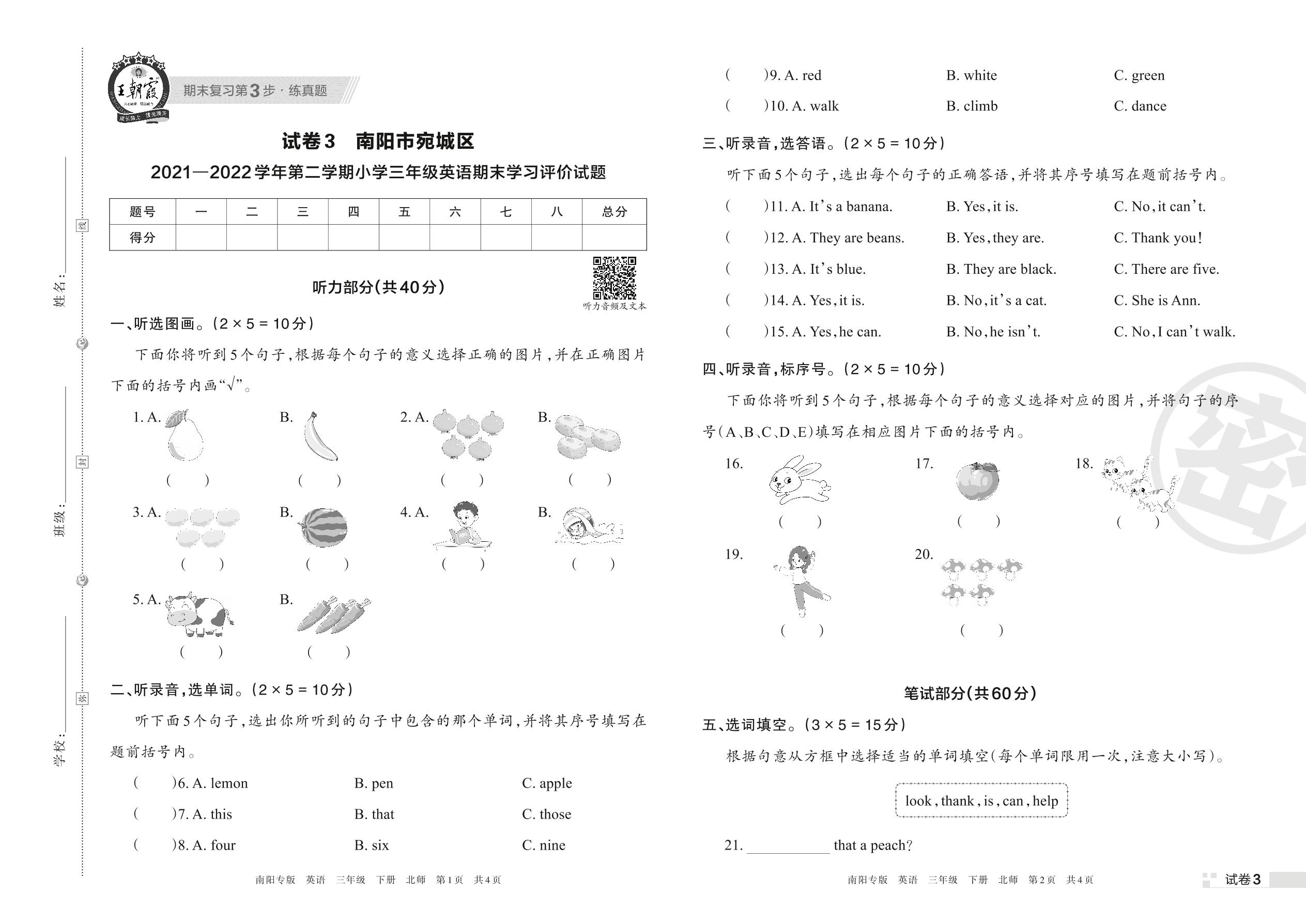 南阳市宛城区2021—2022学年第二学期小学三年级英语期末学习评价试题(北师版)【3】