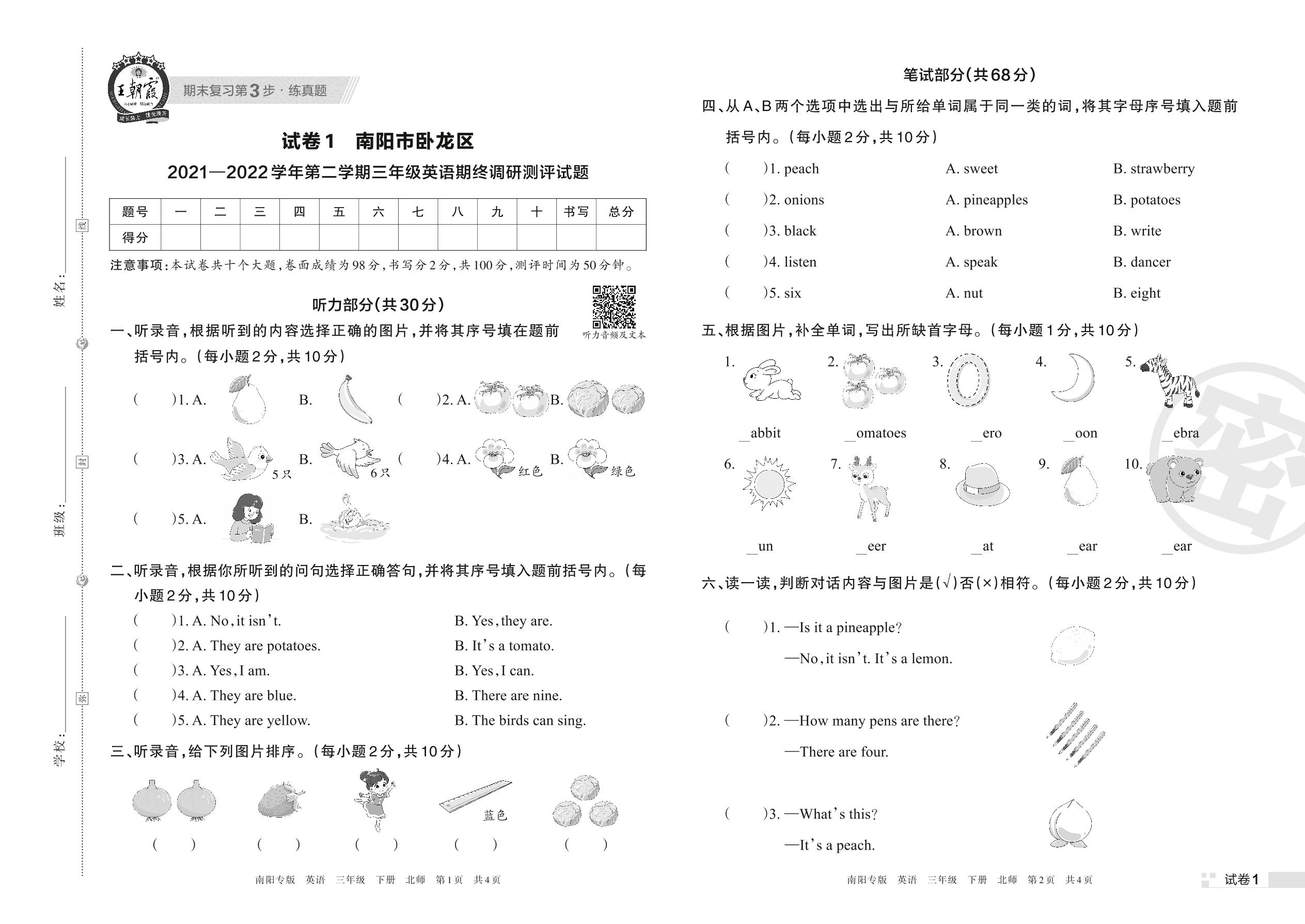 南阳市卧龙区2021—2022学年第二学期三年级英语期终调研测评试题(北师版)【1】