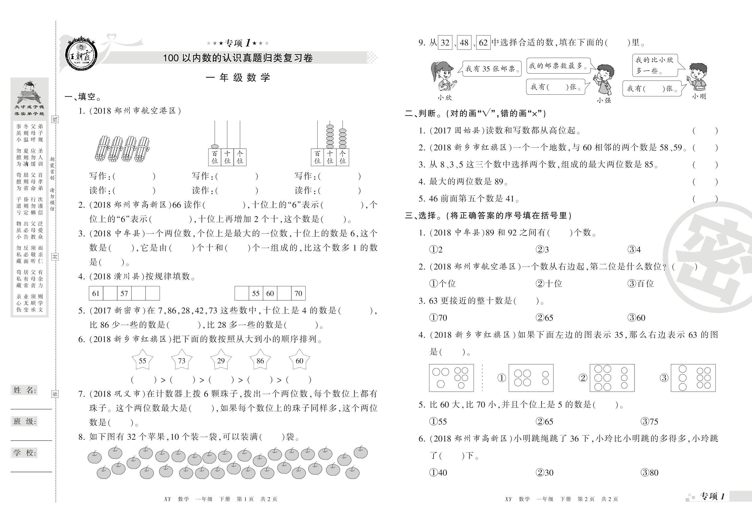 王朝霞期末专项卷——100以内数的认识、100以内加减法的计算(一)真题归类复习卷一年级下册数学(人教版)_R210802220131【0】