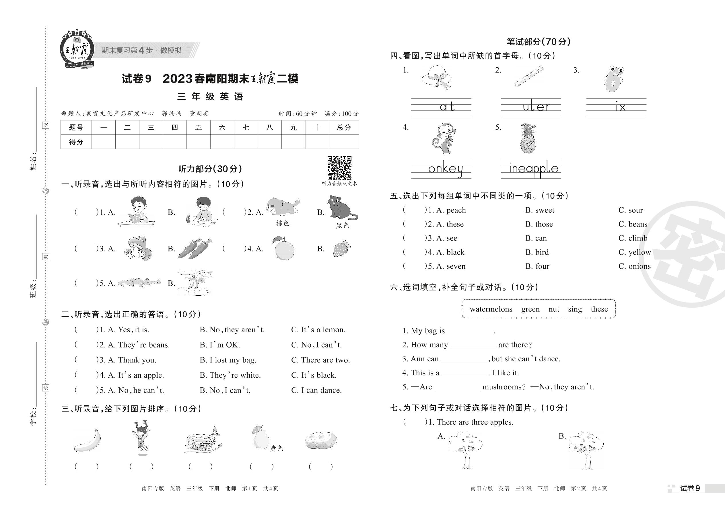 王朝霞期末模拟卷三年级下册英语(北师版)【9】