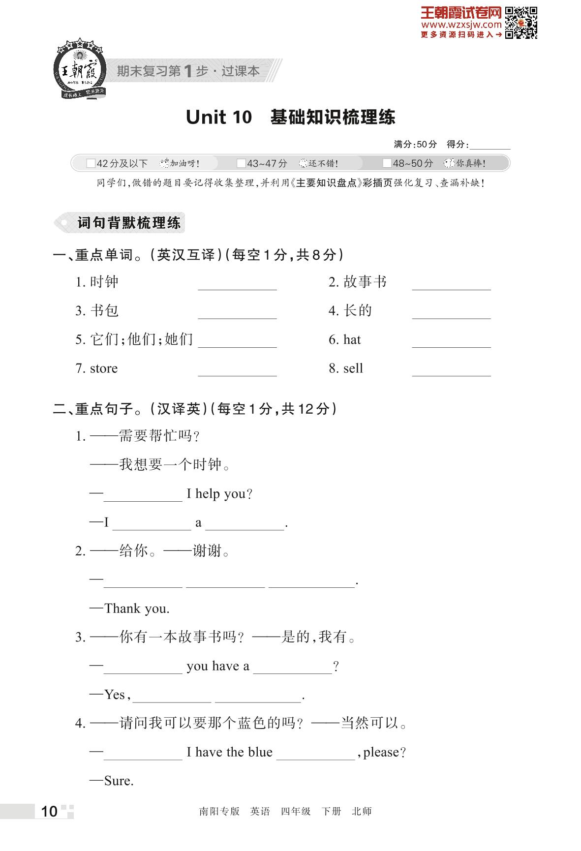 王朝霞期末过课本——Unit 10 基础知识梳理练四年级下册英语(北师版)