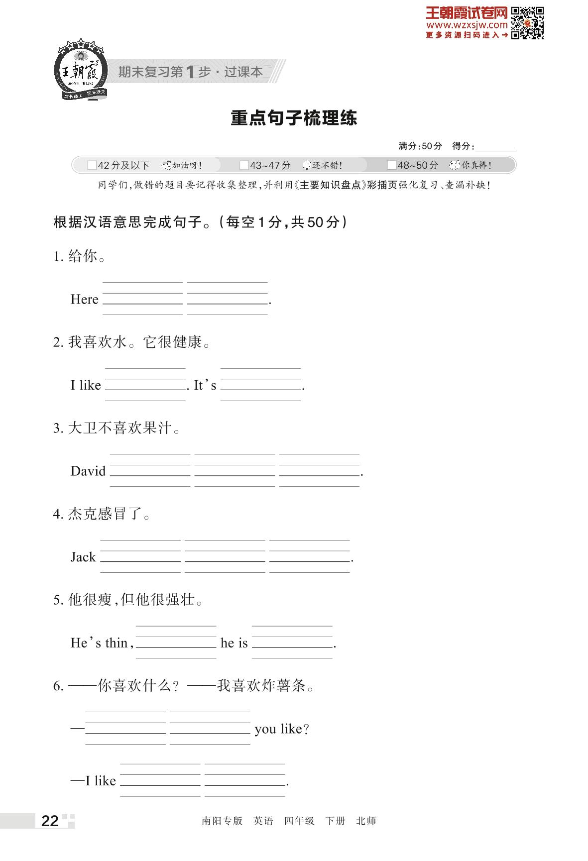 王朝霞期末过课本——重点句子梳理练四年级下册英语(北师版)_R230424142835901