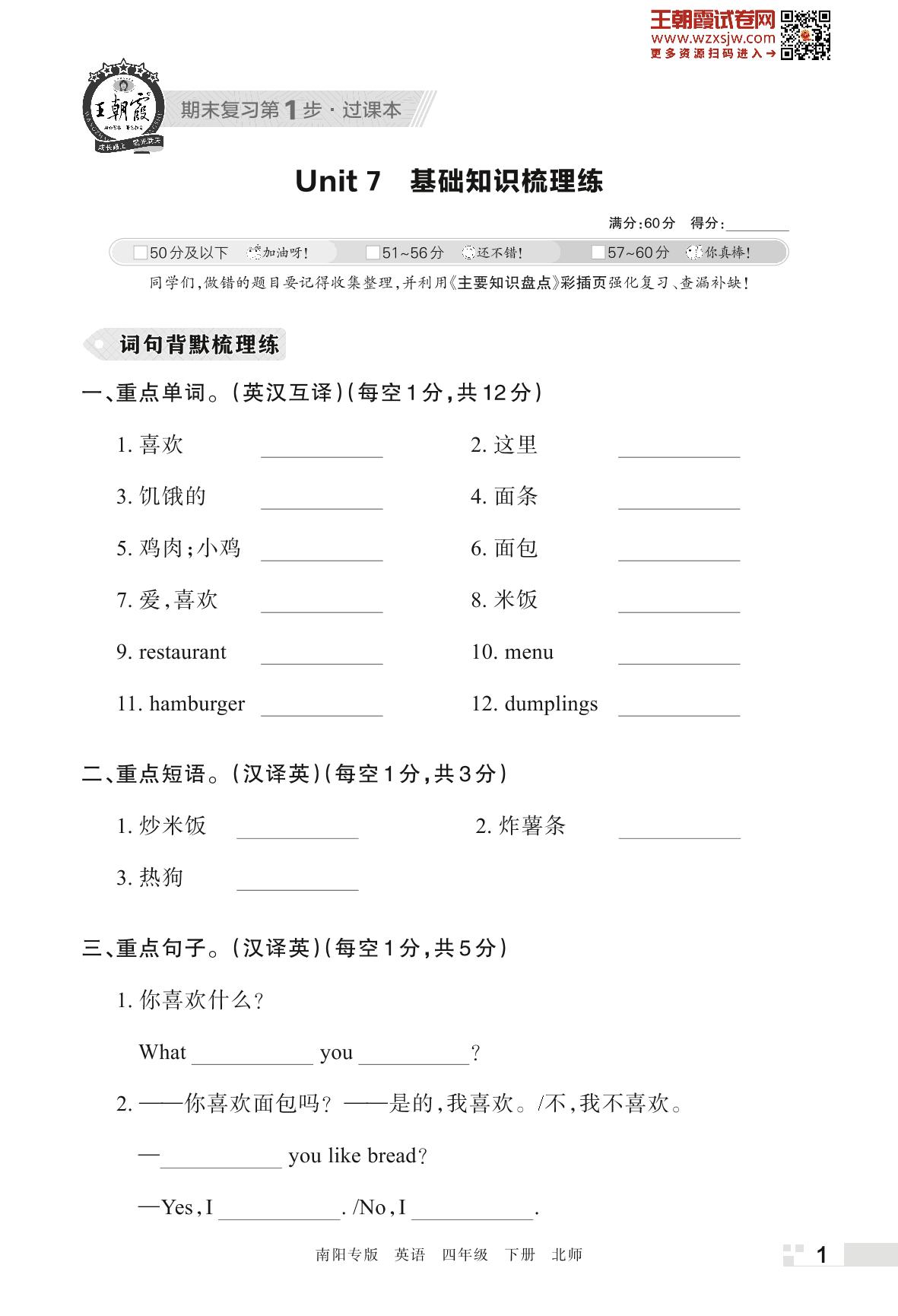 王朝霞期末过课本——Unit 7 基础知识梳理练四年级下册英语(北师版)