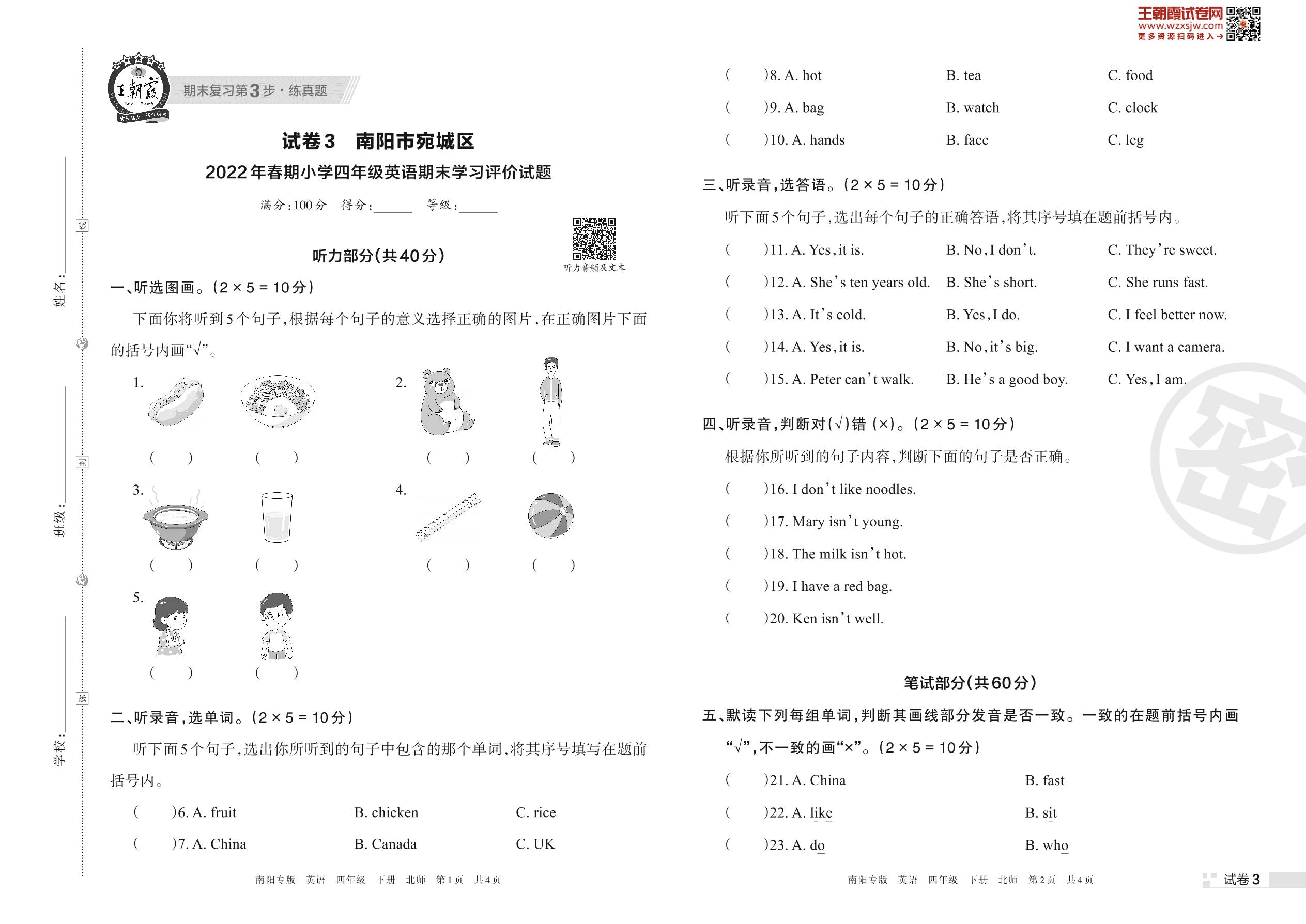 南阳市宛城区2022年春期小学四年级英语期末学习评价试题(北师版)【3】