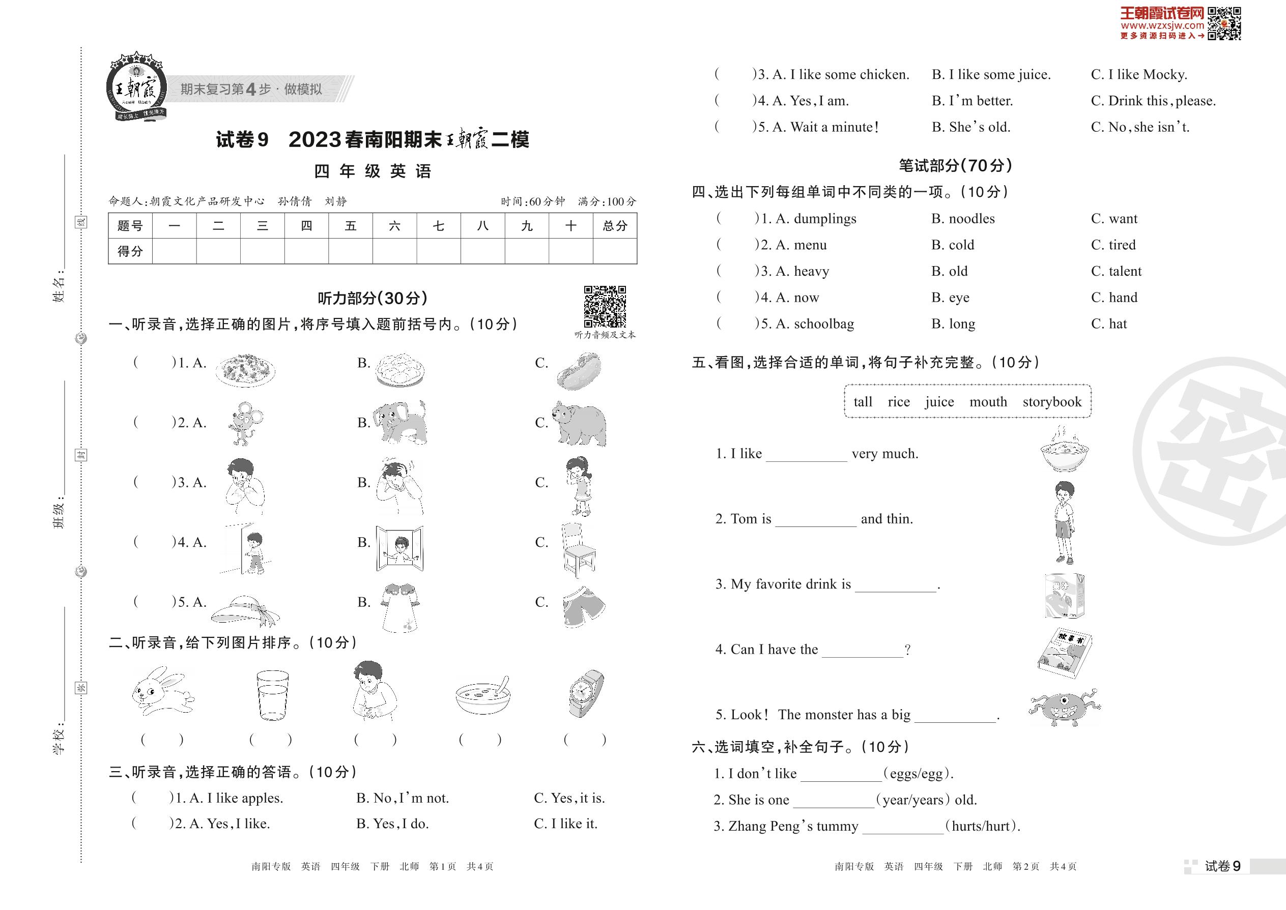王朝霞期末模拟卷四年级下册英语(北师版)【9】