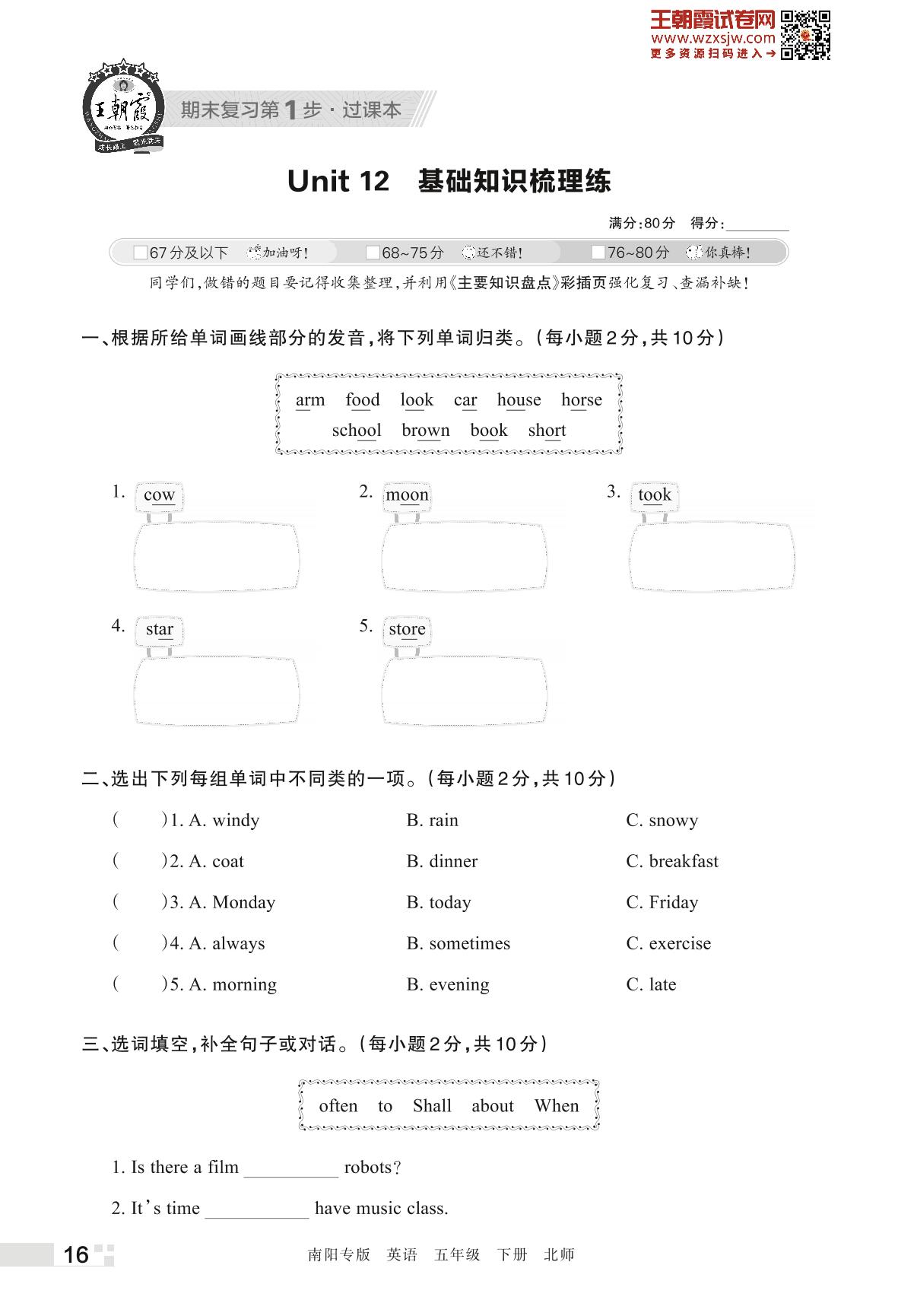 王朝霞期末过课本——Unit 12 基础知识梳理练五年级下册英语(北师版)