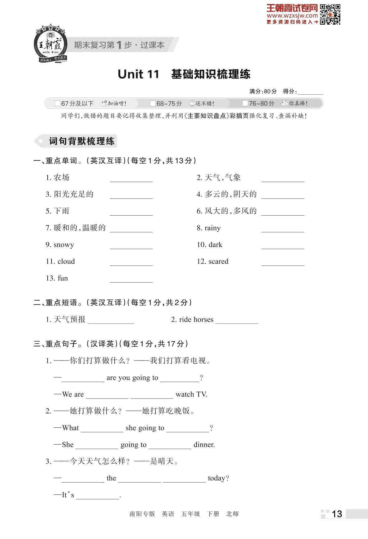 王朝霞期末过课本——Unit 11 基础知识梳理练五年级下册英语(北师版)