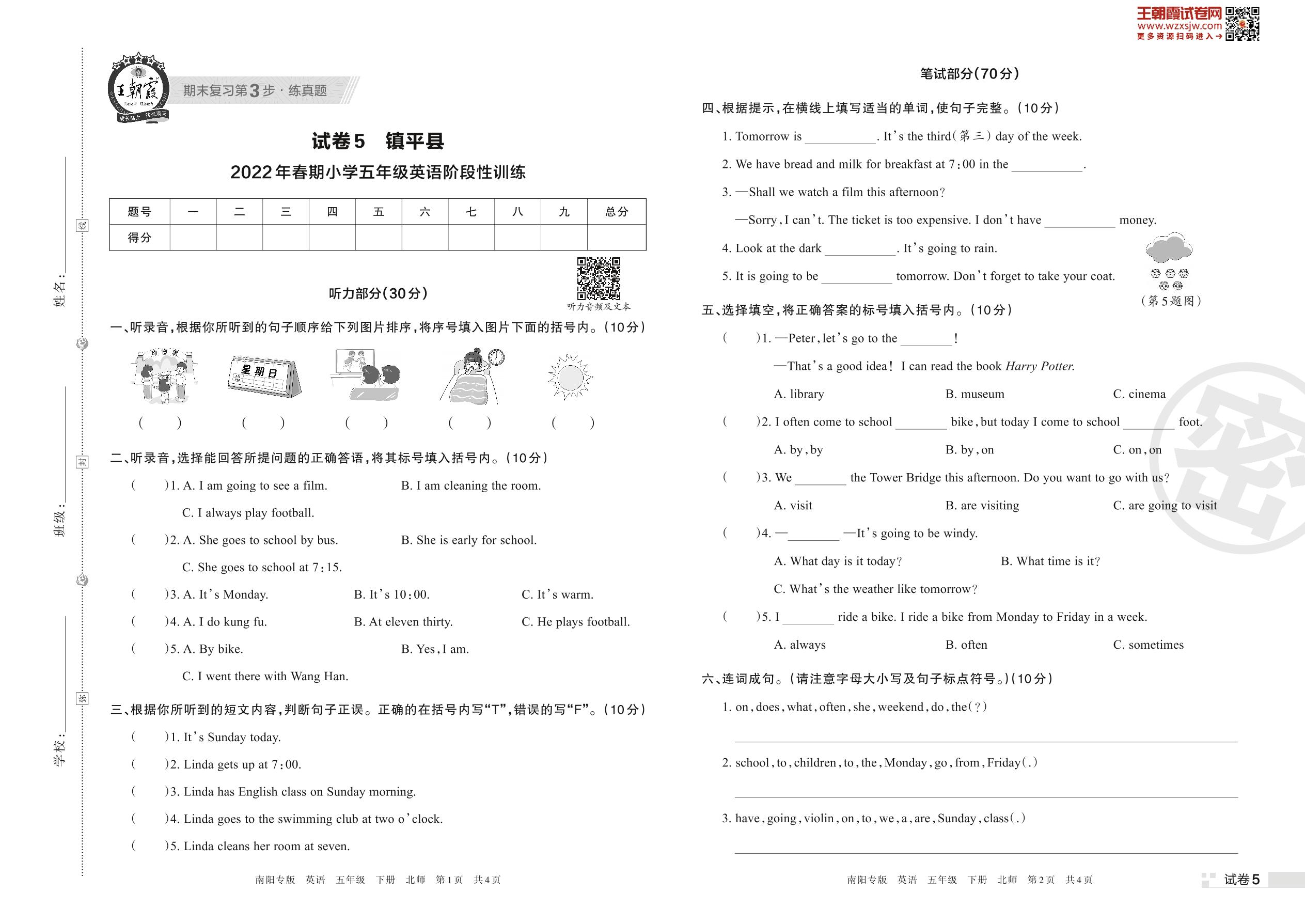 镇平县2022年春期小学五年级英语阶段性训练(北师版)【5】