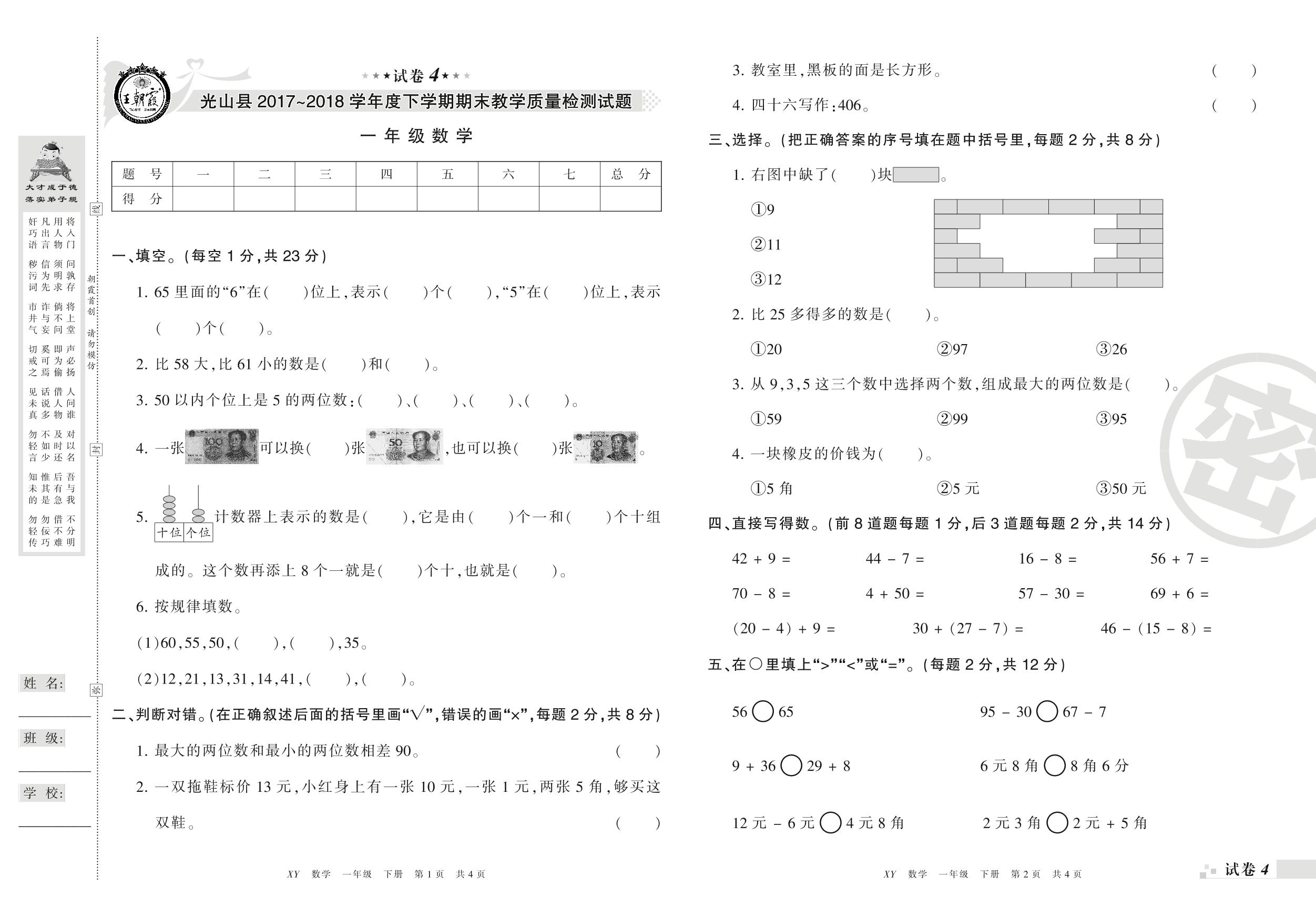 2017-2018学年第二学期信阳市光山县一年级数学试卷(人教版)【4】