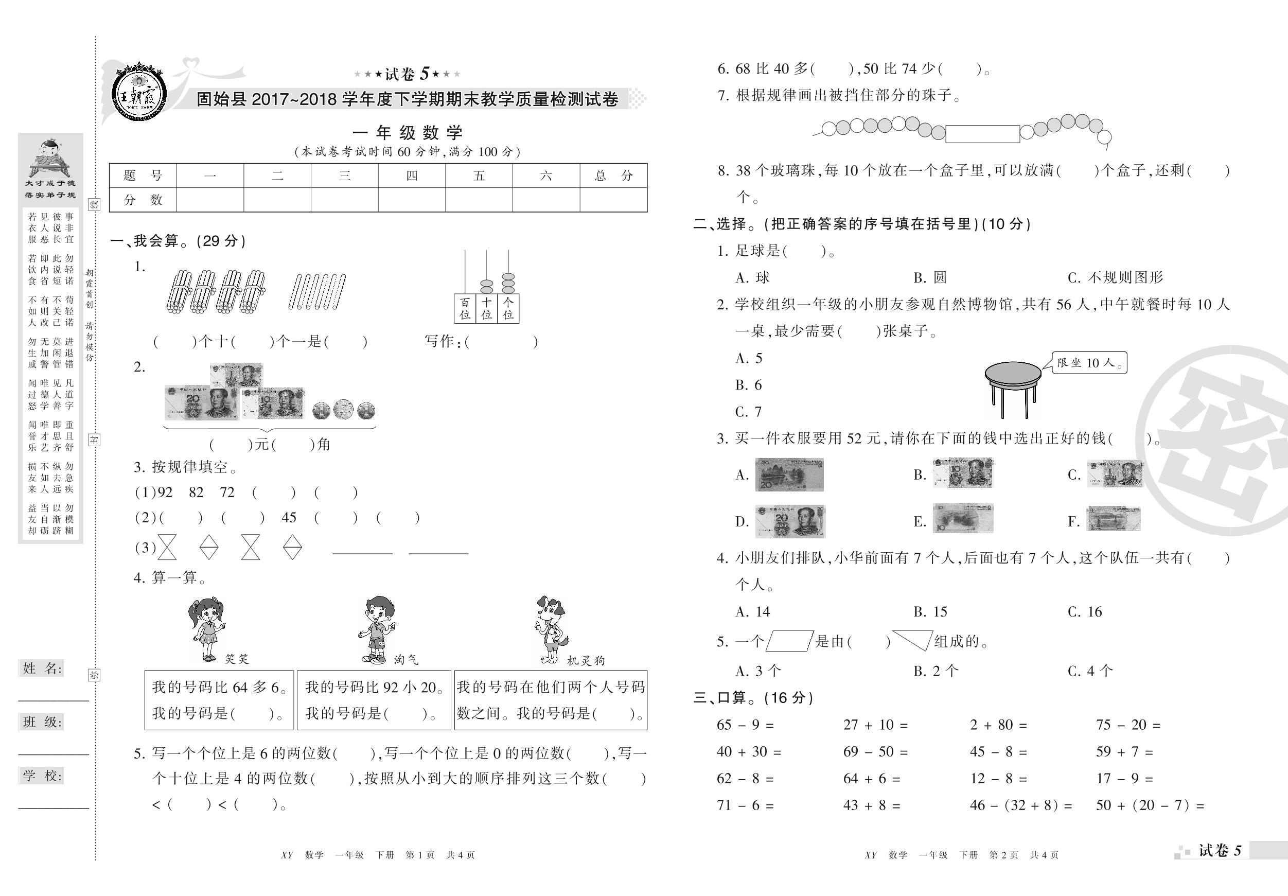 2017-2018学年第二学期信阳市固始县一年级数学试卷(人教版)【5】
