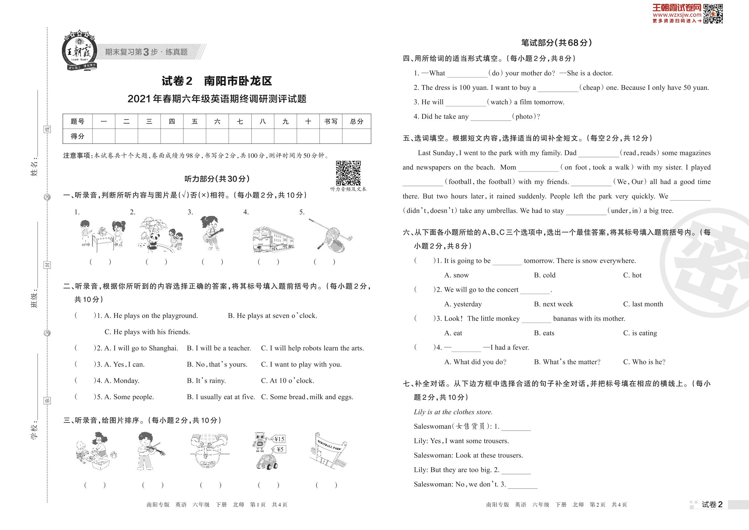 南阳市卧龙区2021年春期六年级英语期终调研测评试题(北师版)【2】