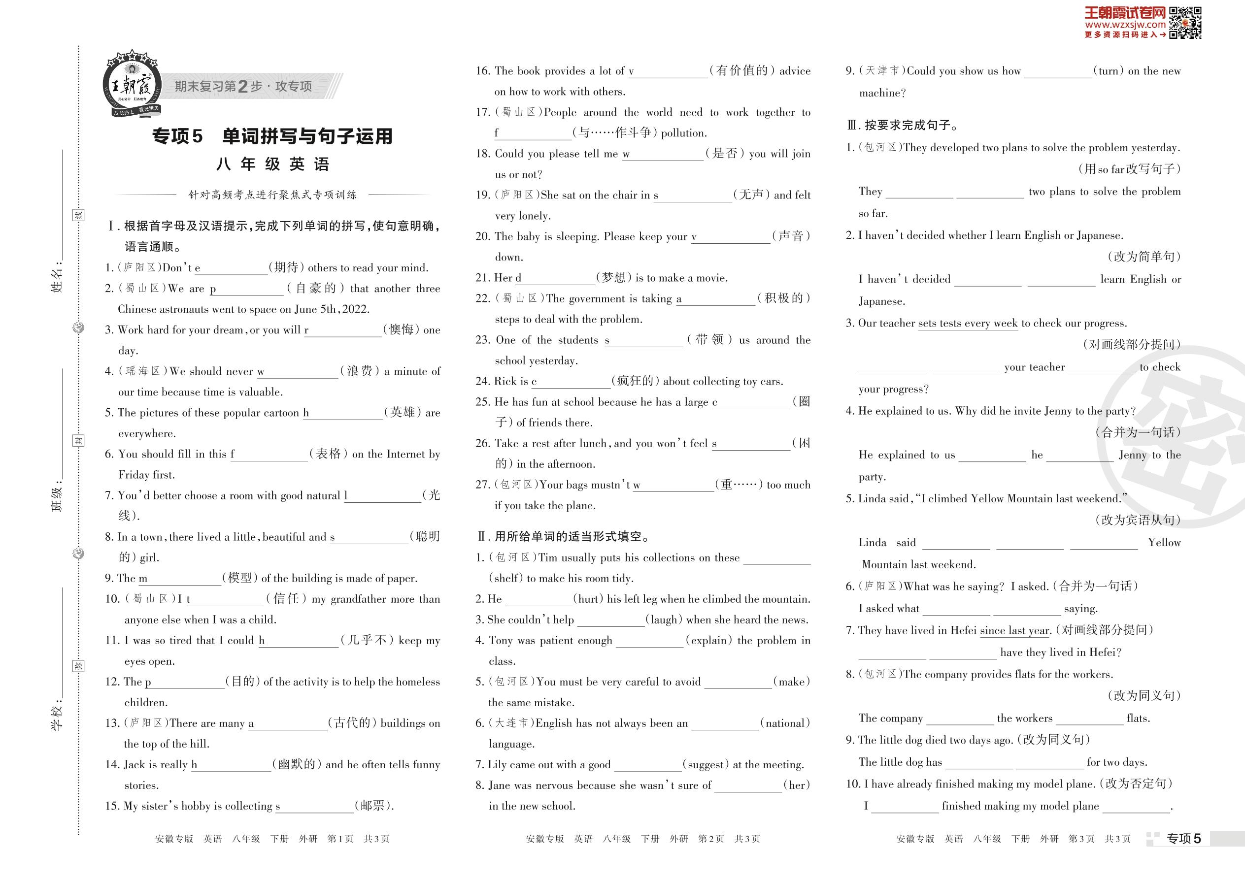 王朝霞期末专项卷——单词拼写与句子运用八年级下册英语(外研版)_R230424144242690【5】