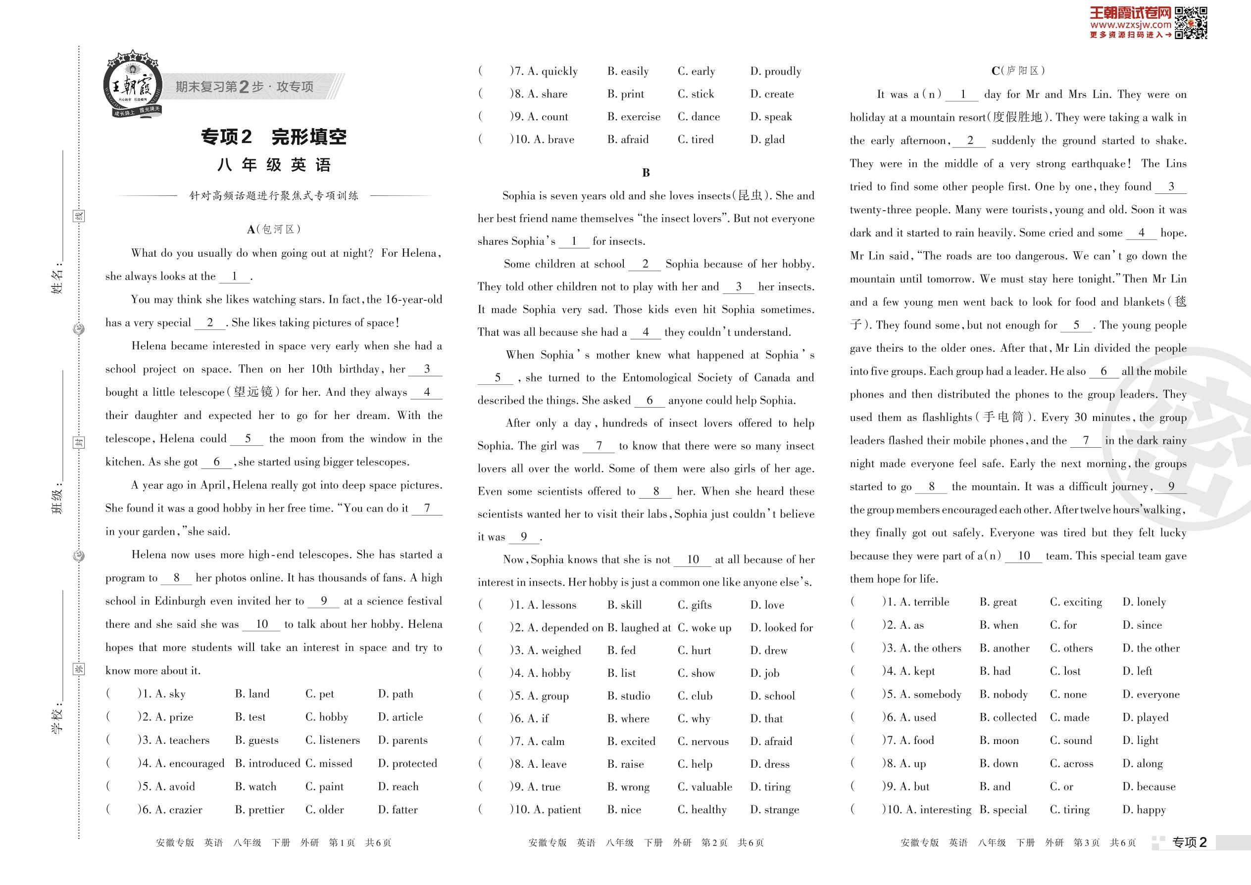 王朝霞期末专项卷——完形填空八年级下册英语(外研版)_R230424144242972【2】