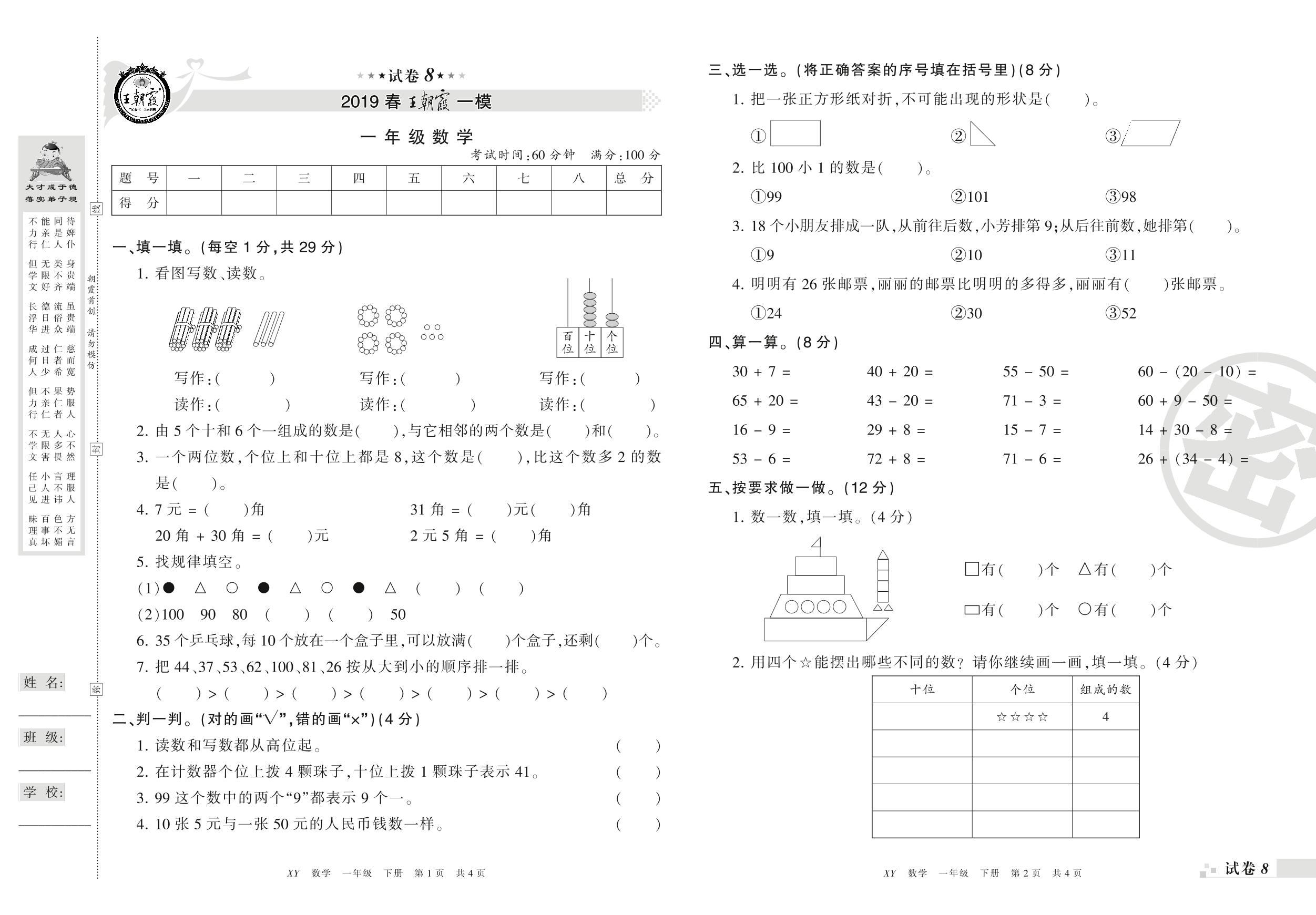 王朝霞期末模拟卷一年级下册数学(人教版)_R210802220203【8】