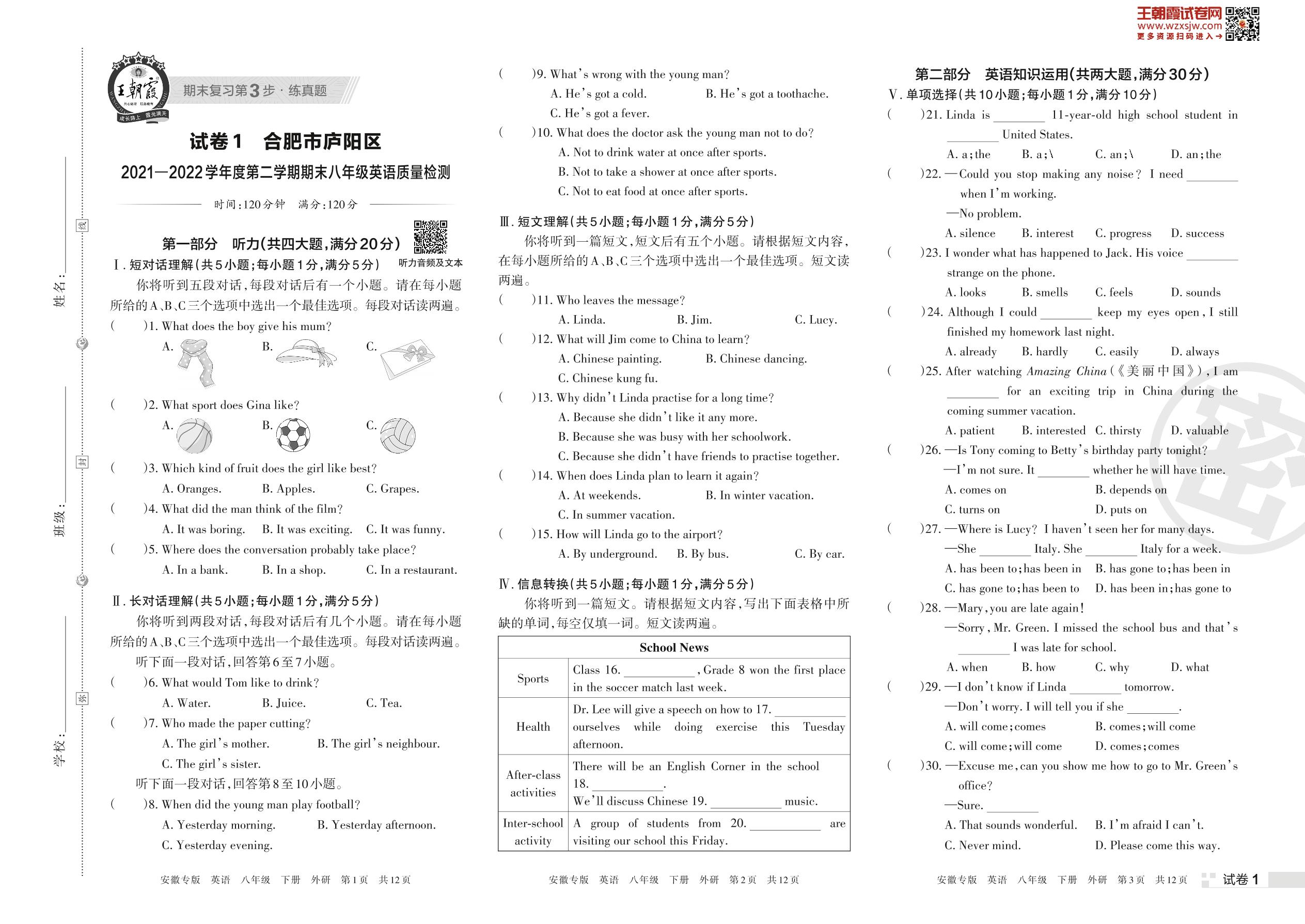 合肥市庐阳区2021—2022学年度第二学期期末八年级英语质量检测(外研版)【1】