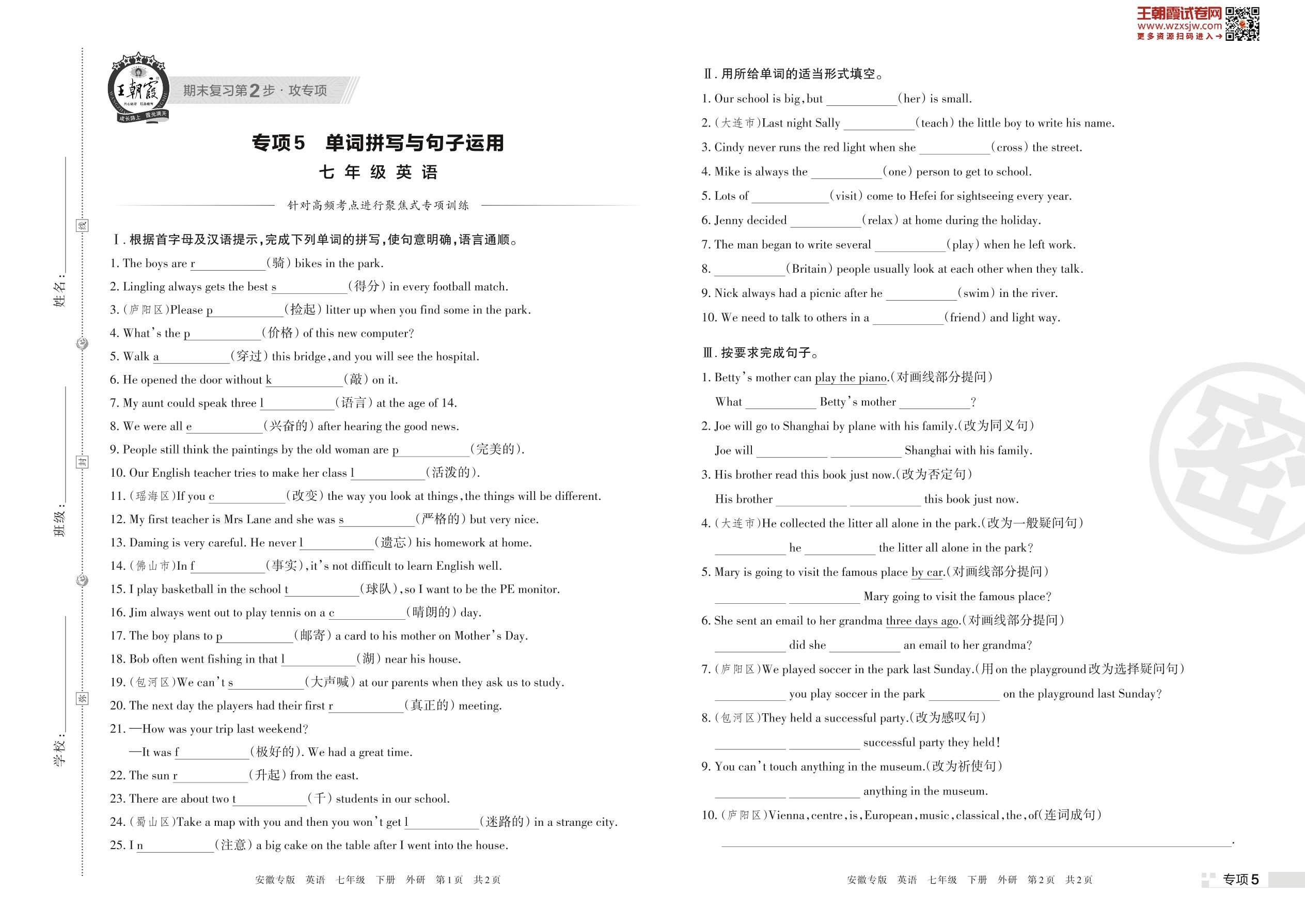王朝霞期末专项卷——单词拼写与句子运用七年级下册英语(外研版)_R230424150700632【5】