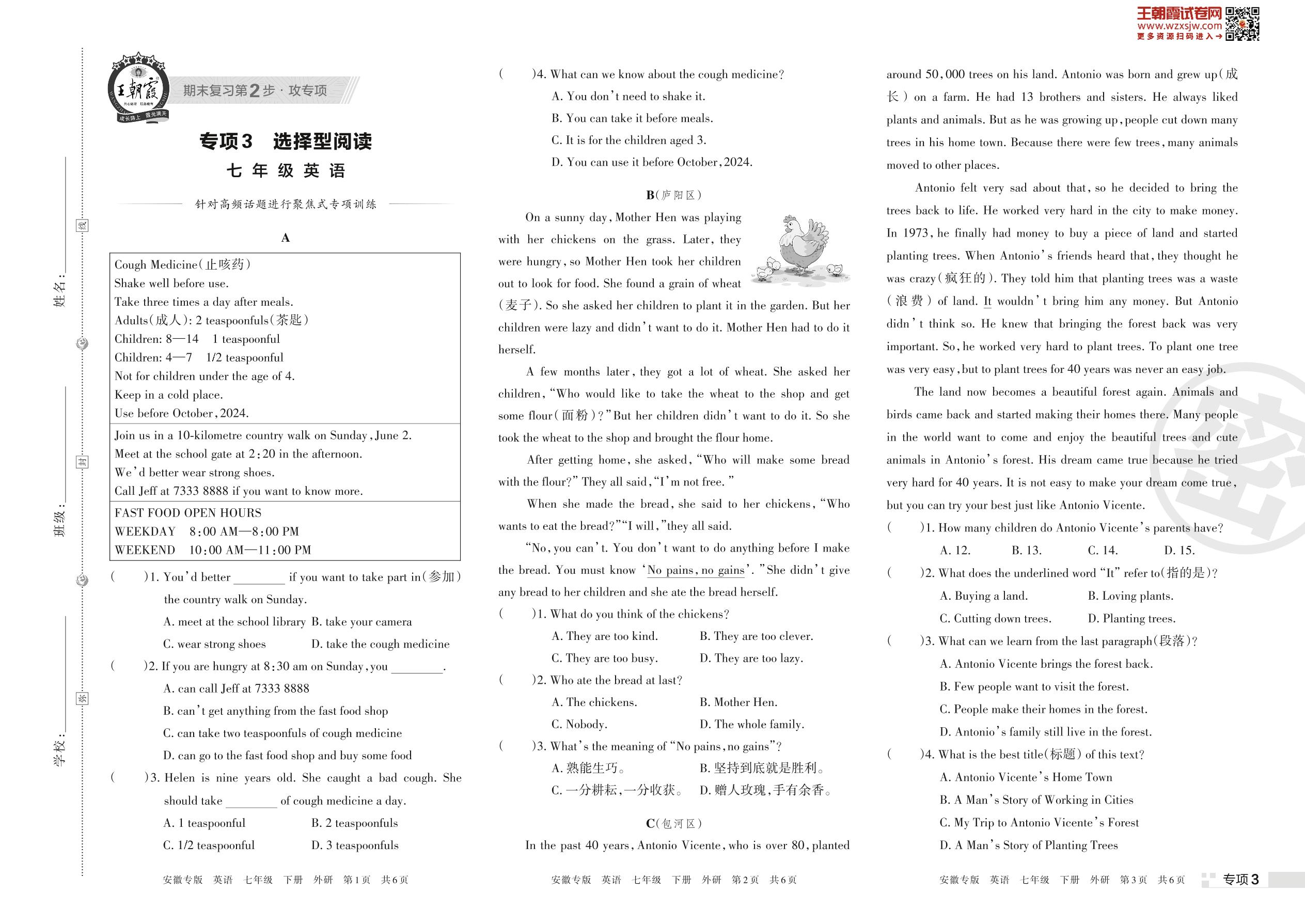 王朝霞期末专项卷——选择型阅读七年级下册英语(外研版)_R230424150700457【3】