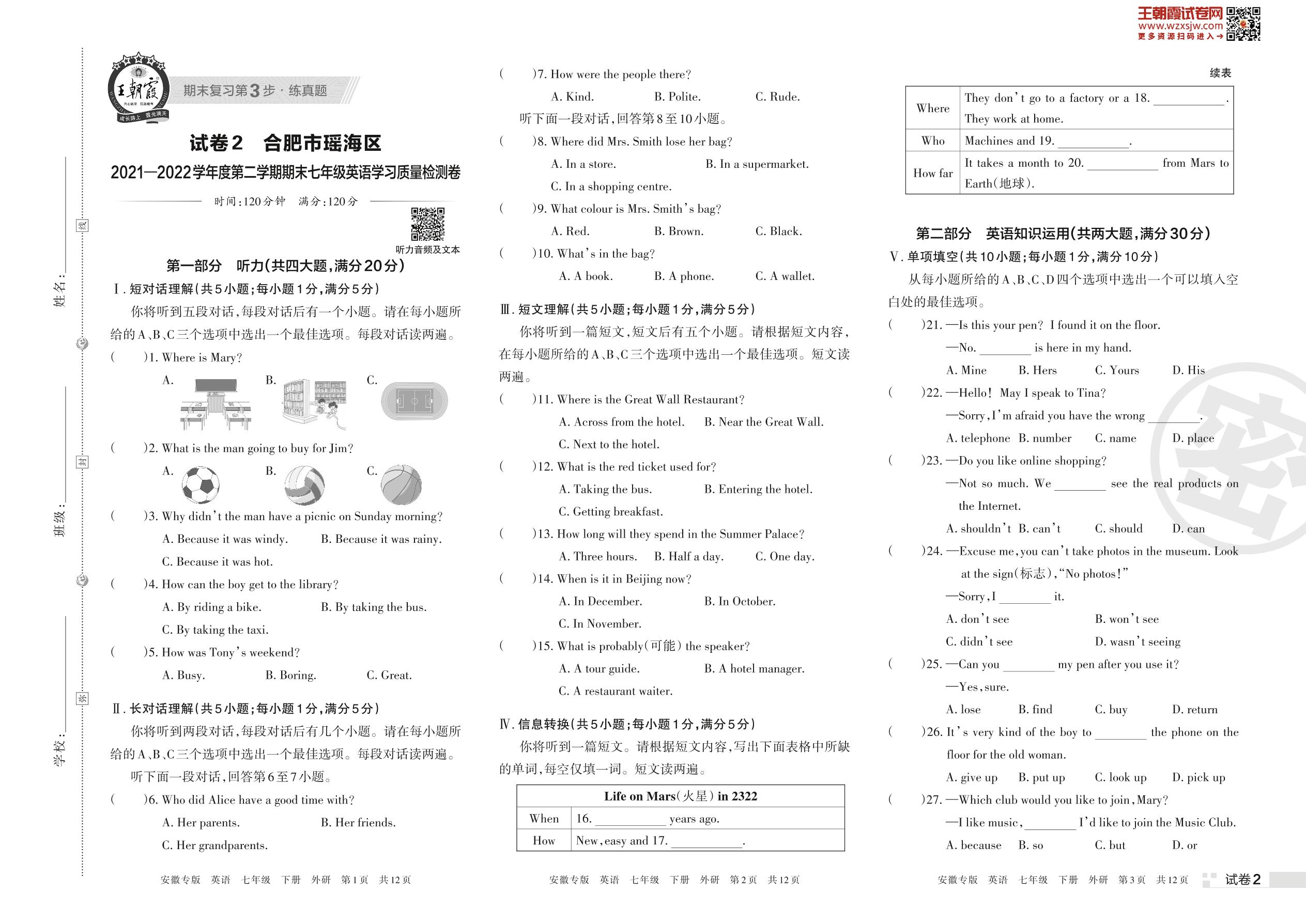 合肥市瑶海区2021—2022学年度第二学期期末七年级英语学习质量检测卷(外研版)【2】