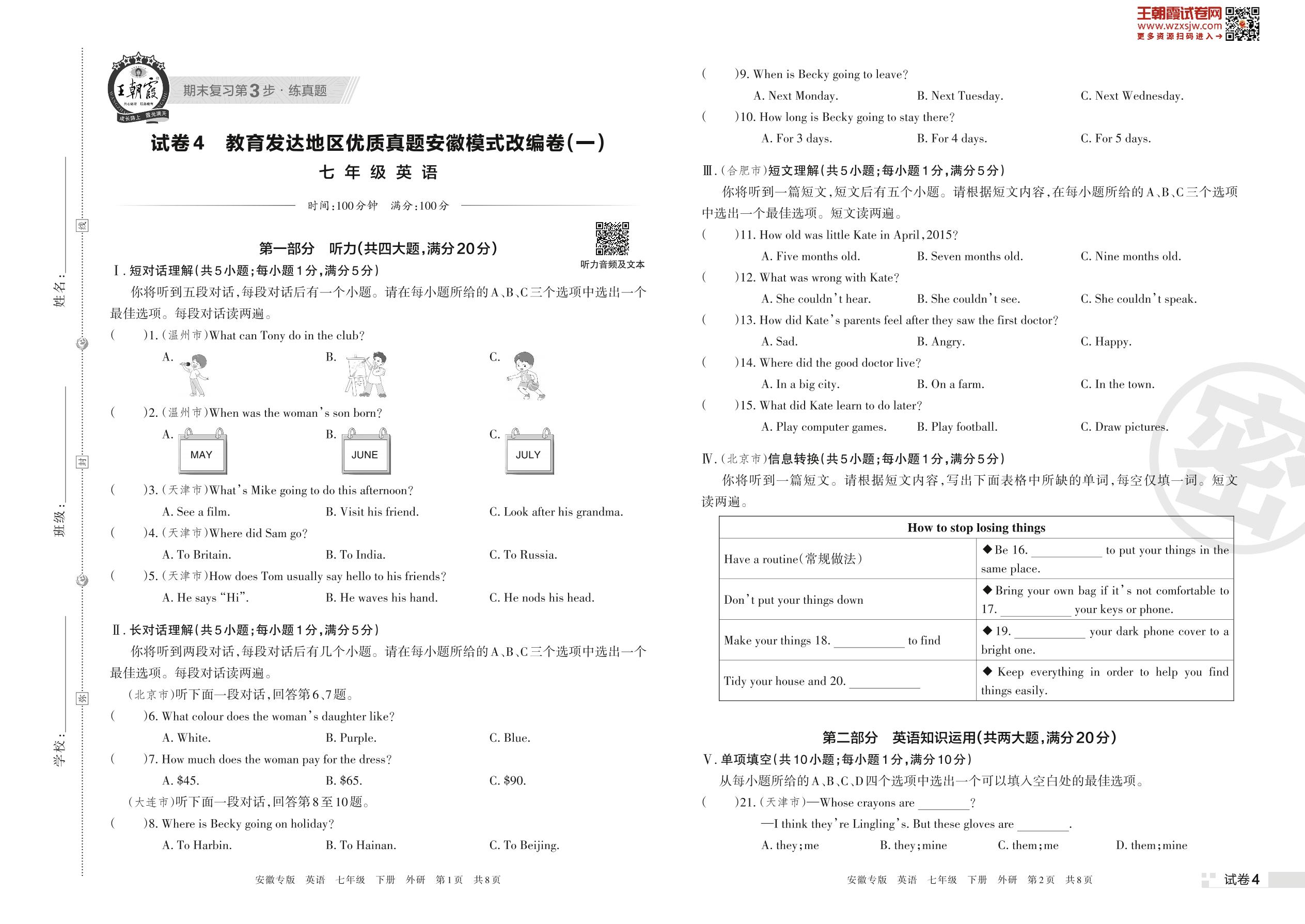 教育发达地区优质真题安徽模式改编卷(一)七年级下册英语(外研版)【4】